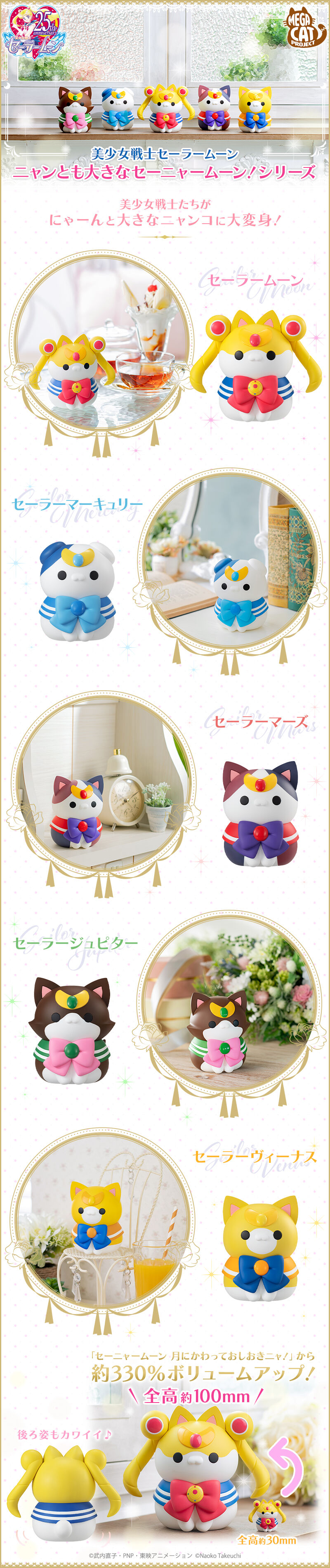 Jutro rozpoczyna się przedsprzedaż na nowe figurki z serii Senya Moon. Te są znacznie większe, niż poprzednie, mają wysokość 100 mm. Do uzbierania jest pięć figurek kotów w strojach inner senshi. Wysyłka nastąpi dopiero w lipcu 2022. Cena za sztukę to
