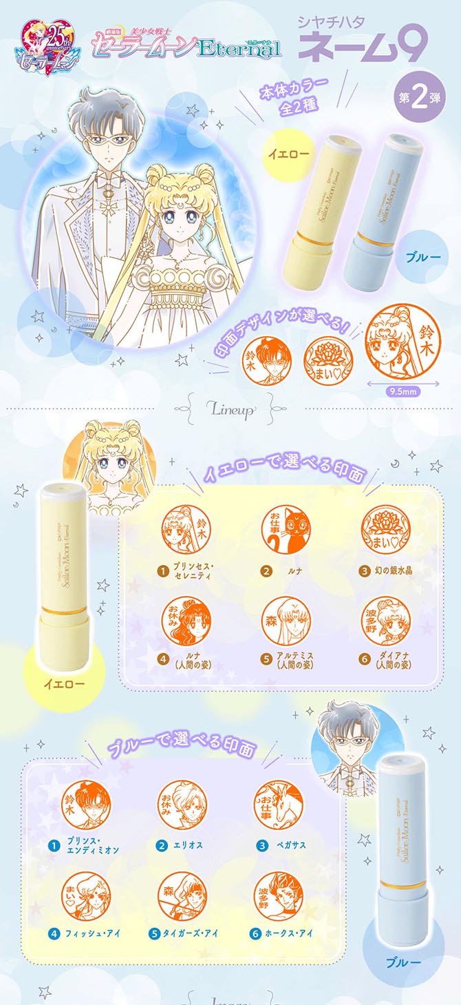 Pojawią się kolejne stemple od Shachihata. Obudowy są inspirowane kolorystycznie Księżniczką Serenity i Księciem Endymionem. Zamawiając stemple, do każdego koloru obudowy do wyboru jest po sześć wzorów stempli. Do żółtej obudowy można wybrać jeden z następujących