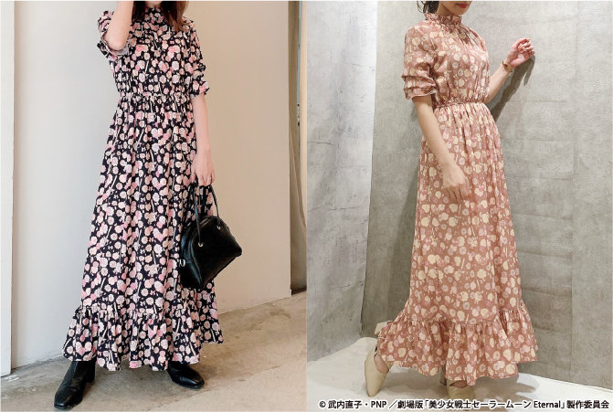 Frill Flower Random One Piece - długa sukienka z falbankami; na całej powierzchni materiału nadruk w kwiatki; do wyboru kolory biały, czarny i beżowy; 17600 jenów (ok. 626 zł) za sztukę.