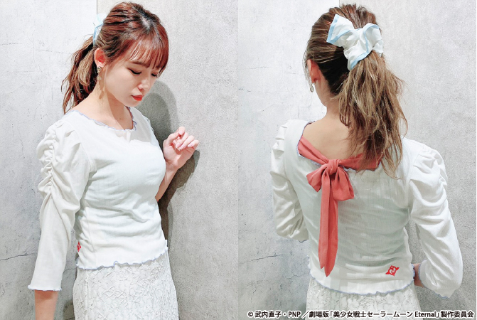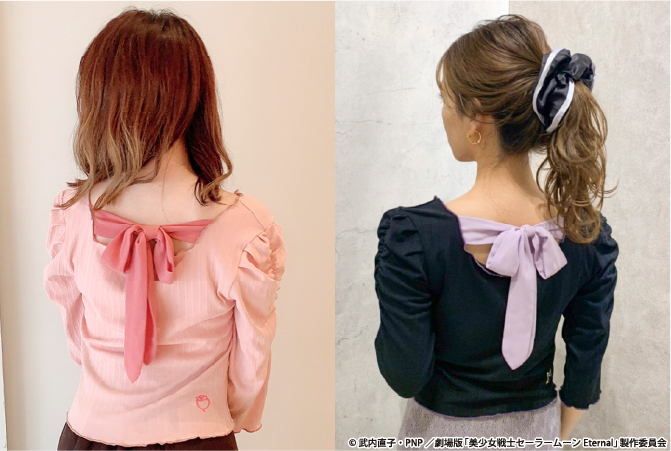 Back Ribbon Rib Tops - bluzki z wiązaniem na plecach; do wyboru kolory biały, różowy lub czarny; poszczególne kolory inspirowane są Super Sailor Moon, Super Sailor Chibi Moon i Luną; z tyłu u doły aplikacje na poszczególnych kolorach z broszką Crisis