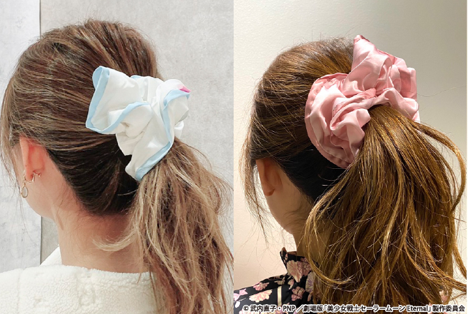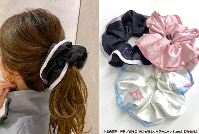 Mark Piping Chouchou - gumki do włosów inspirowane Super Sailor Moon, Super Sailor Chibi Moon i Luną z nadrukiem z Crisis Moon Compact, Chibi Moon Compact i głową Luny; w kolorach białym, różowym i czarnym; 2090 jenów (ok. 74 zł).