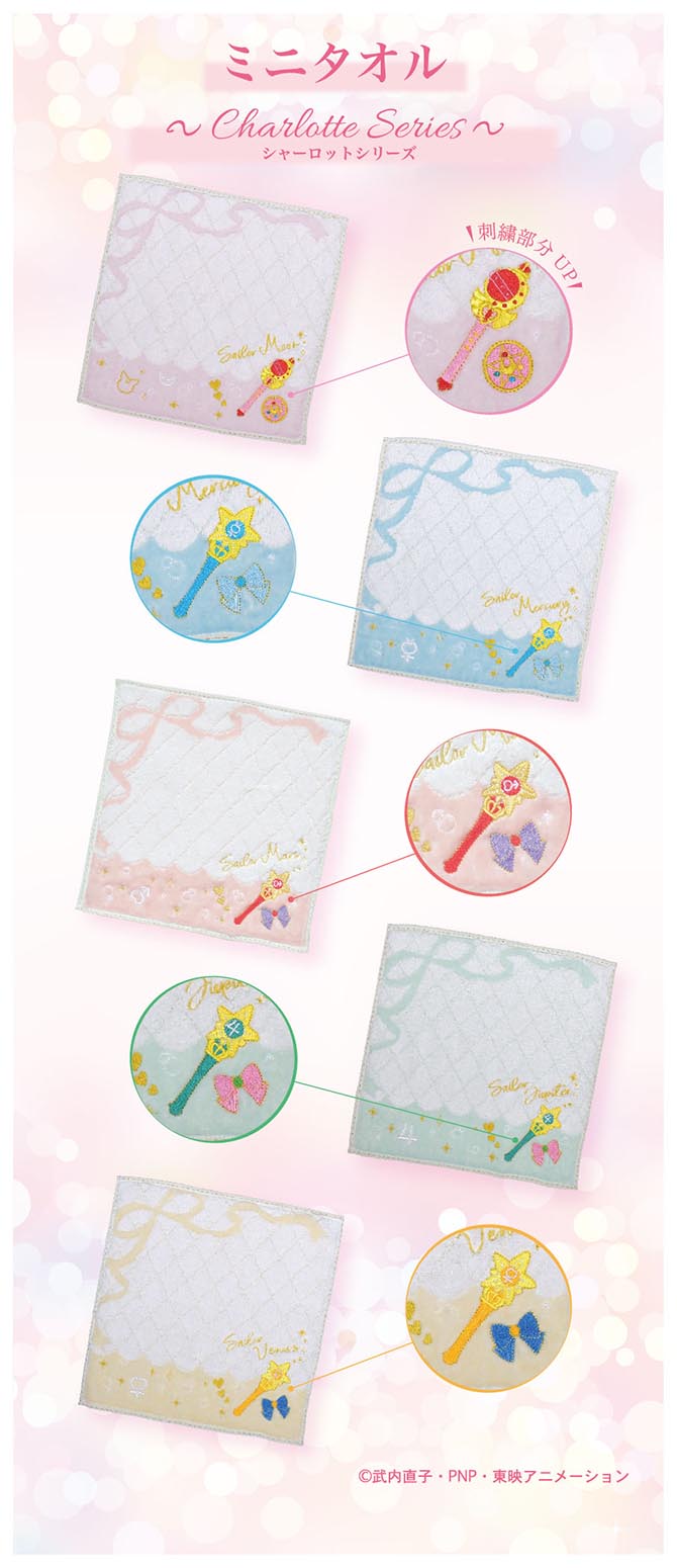 W lutym pojawią się w sprzedaży mini ręczniki z aplikacjami w postaci magicznych przedmiotów, kokard, znaków planet itd. Ręczniki są wielkości 25 x 25 cm i do wyboru będzie 5 wzorów inspirowanych inner senshi. Cena za sztukę to 660 jenów (ok. 24 zł).