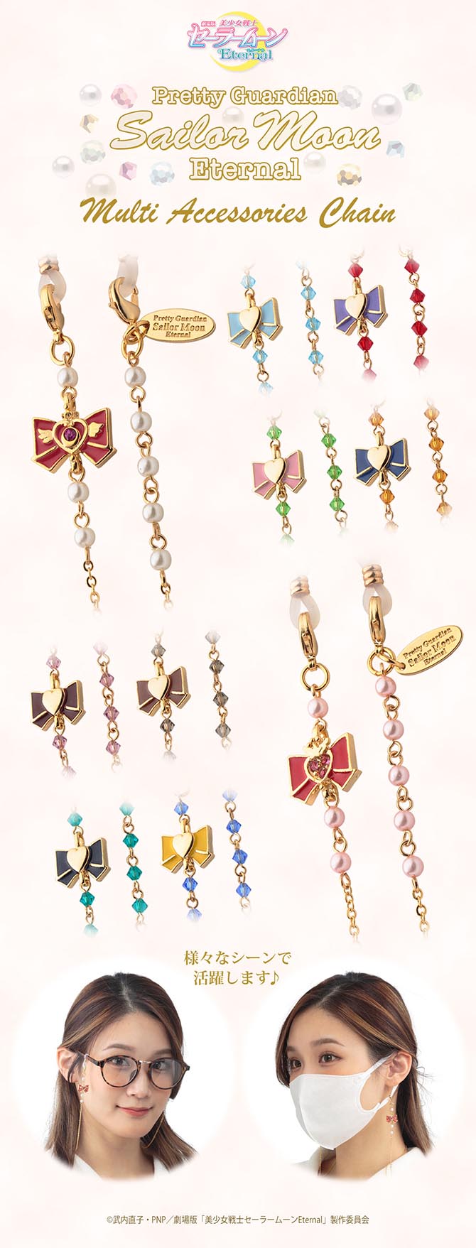 Zapowiedziano ozdobne łańcuszki różnorakiego wykorzystania. Można je nosić jako uchwyt do maseczki czy do okularów (w zestawie znajdują się silikonowe końcówki na okulary) lub po prostu jako zwykłą biżuterię. Do wyboru jest 10 wzorów, każdy inspirowany inną wojowniczką. Te inspirowane Sailor Moon i Sailor Chibi Moon ozdobione są perełkami, a pozostałe kolorowymi kryształkami. Cena za sztukę to 3949 jenów (ok. 142 zł). Przedsprzedaż rozpoczęła się 15 grudnia, a wysyłka nastąpiła w marcu 2022.