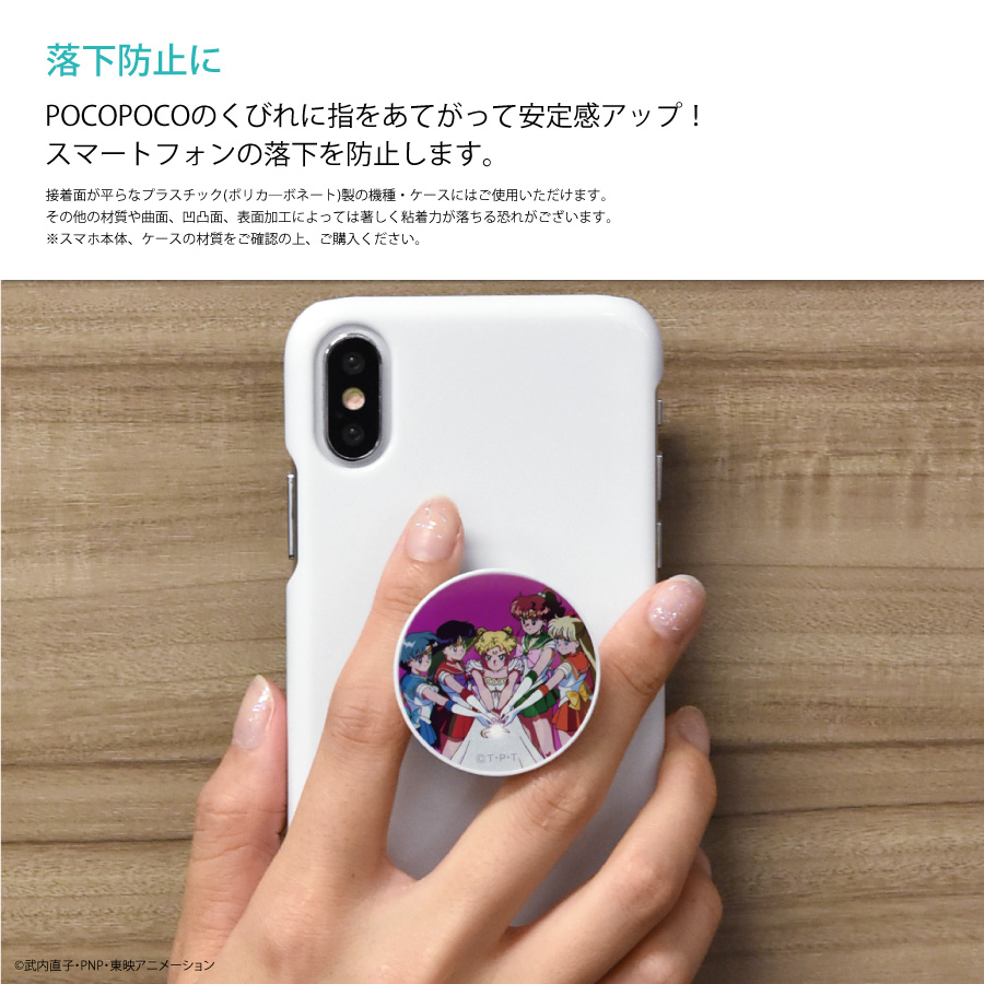 POCOPOCO - uchwyt do smartfonów ułatwiający trzymanie; może służyć również jako podpórka do ustawienia telefonu; wysuwa się poprzez odkręcenie; dostępne te same wzory, co w przypadku etui ze szkła hybrydowego; 2068 jenów (ok. 73 zł) za sztukę.