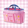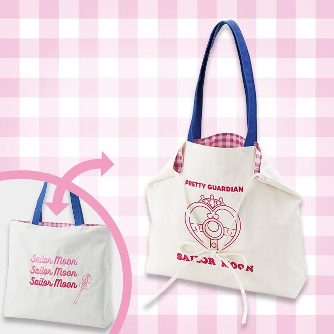Tote Bag - torba materiałowa na zakupy; biała z broszką Cosmic Heart Compact, wewnątrz materiał w czerwoną kratę; 3200 jenów (ok. 114 zł). Interior Bag - torba z kieszeniami na zewnątrz; różowa z nadrukiem broszek i magicznych
