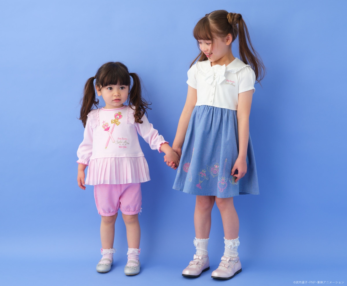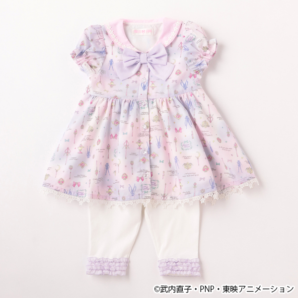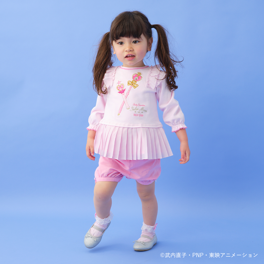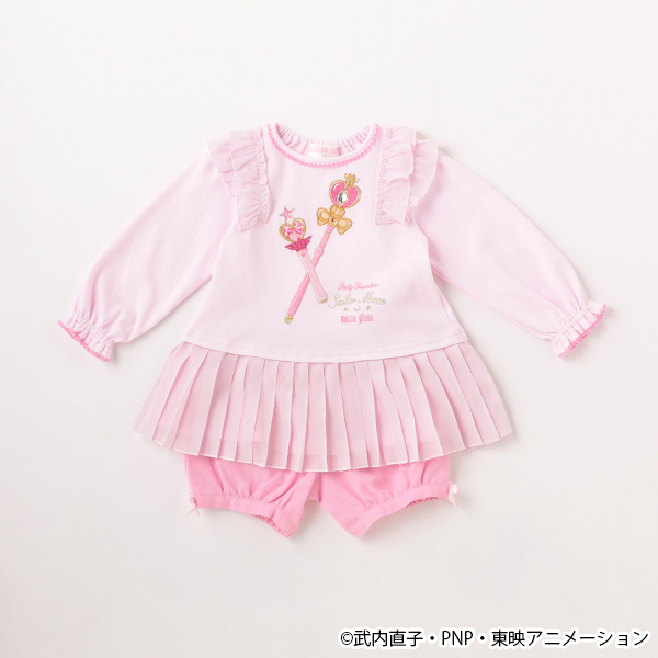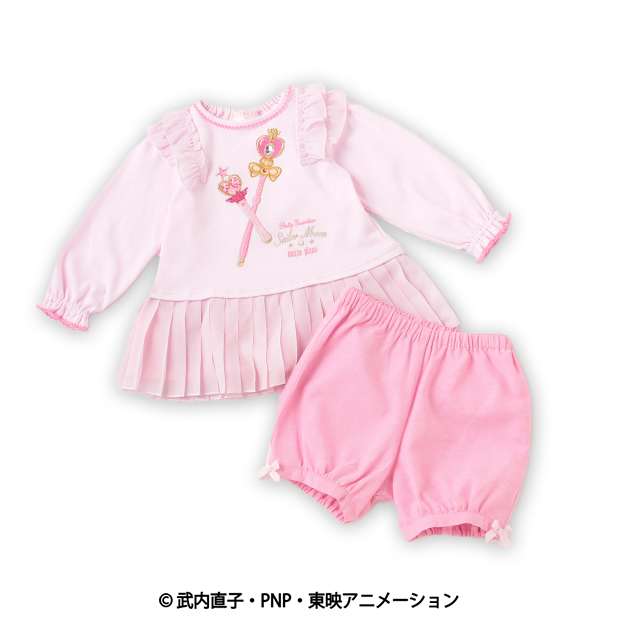 Różowy zestaw z koszulką i spodenkami - na koszulce aplikacja z berłem Sailor Moon i pałeczką Sailor Chibi Moon; dół koszulki jest plisowany, aby przypominał strój wojowniczki; dostępne rozmiary to 80/90 cm; 17 380 jenów (ok. 618 zł).