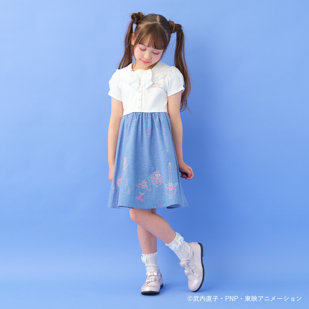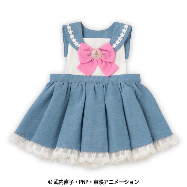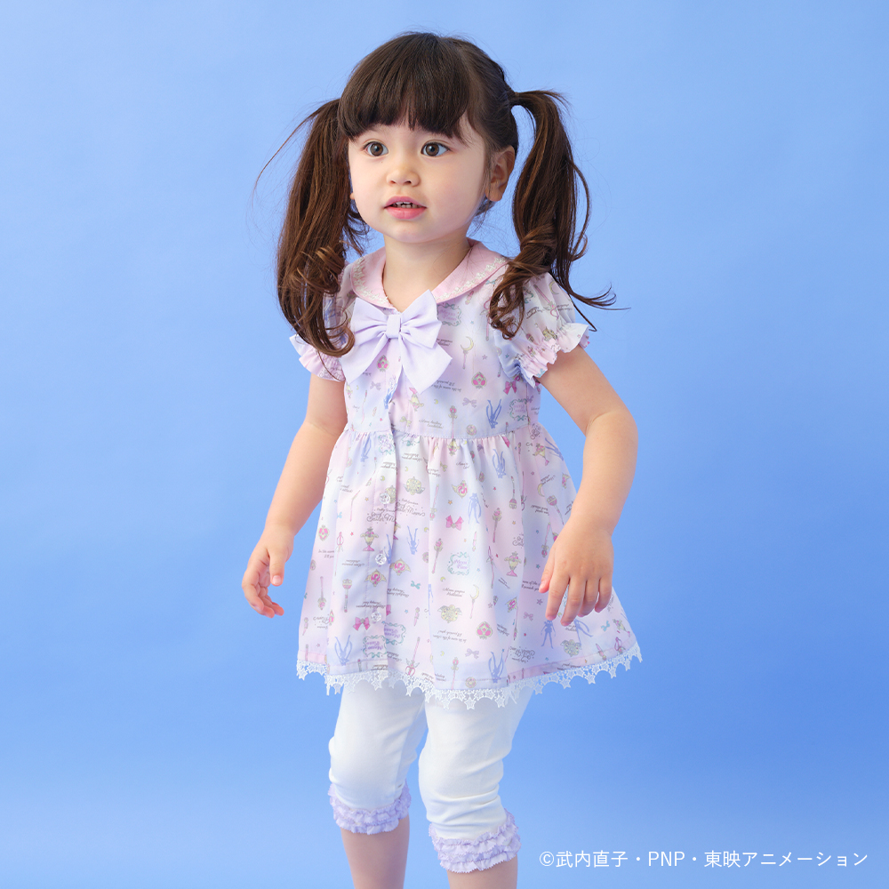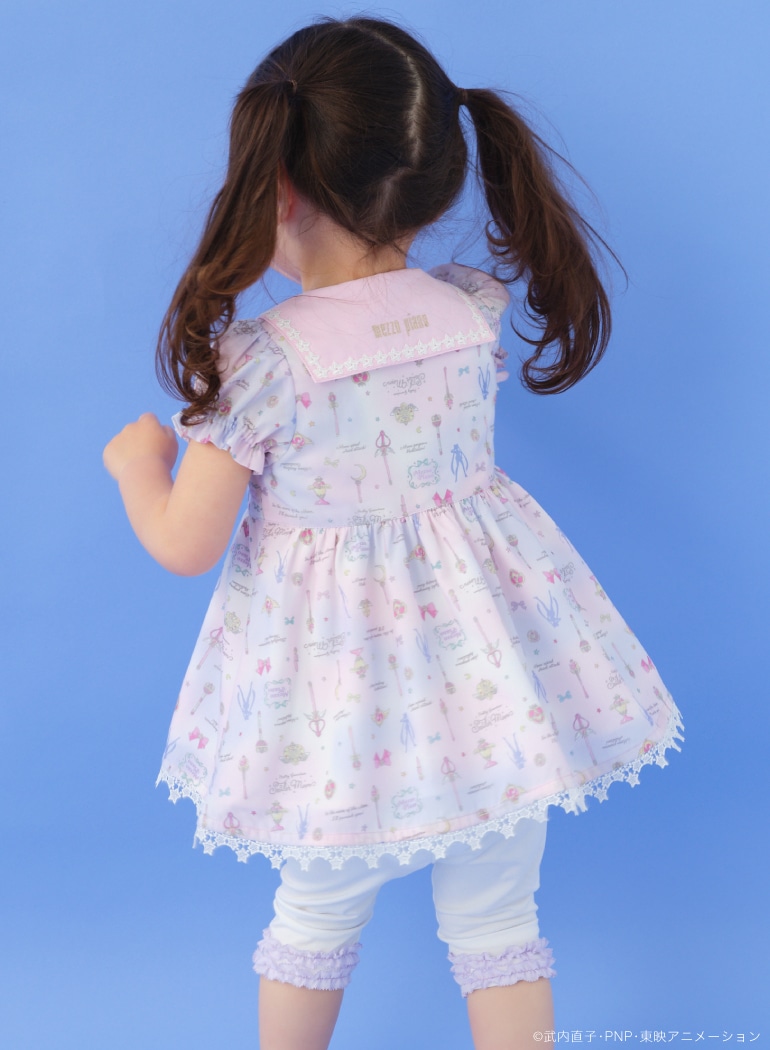 Różowy zestaw z koszulką i spodenkami - na koszulce aplikacja z berłem Sailor Moon i pałeczką Sailor Chibi Moon; dół koszulki jest plisowany, aby przypominał strój wojowniczki; dostępne rozmiary to 80/90 cm; 17 380 jenów (ok. 618 zł).