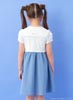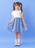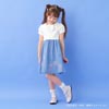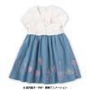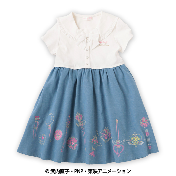 Sukienka z magicznymi przedmiotami na spódnicy - biało-granatowa; dostępne rozmiary to 100/110/120/130 cm; 16 280 jenów (ok. 579 zł).