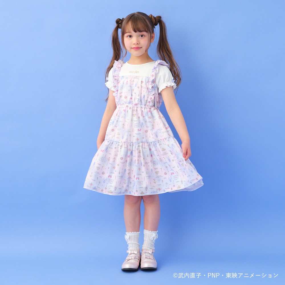 Sukienka z nadrukiem w magiczne przedmioty - w kolorystyce różu i fioletu; nadruk na całej powierzchni materiału; dostępne rozmiary to 100/110/120/130 cm; 17 380 jenów (ok. 618 zł).