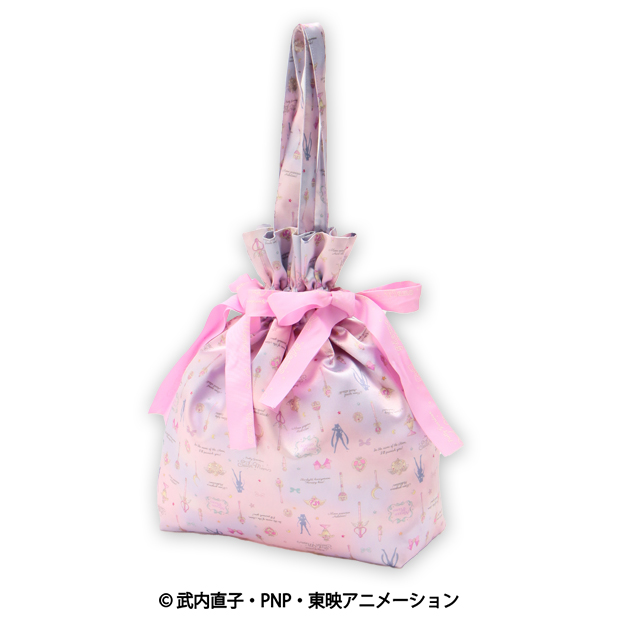 Torba materiałowa ze ściąganym sznureczkiem - na torbie znajduje się ten sam nadruk w magiczne przedmioty, co na sukience i zestawie, ale materiał jest satynowy; 4290 jenów (ok. 13 zł).