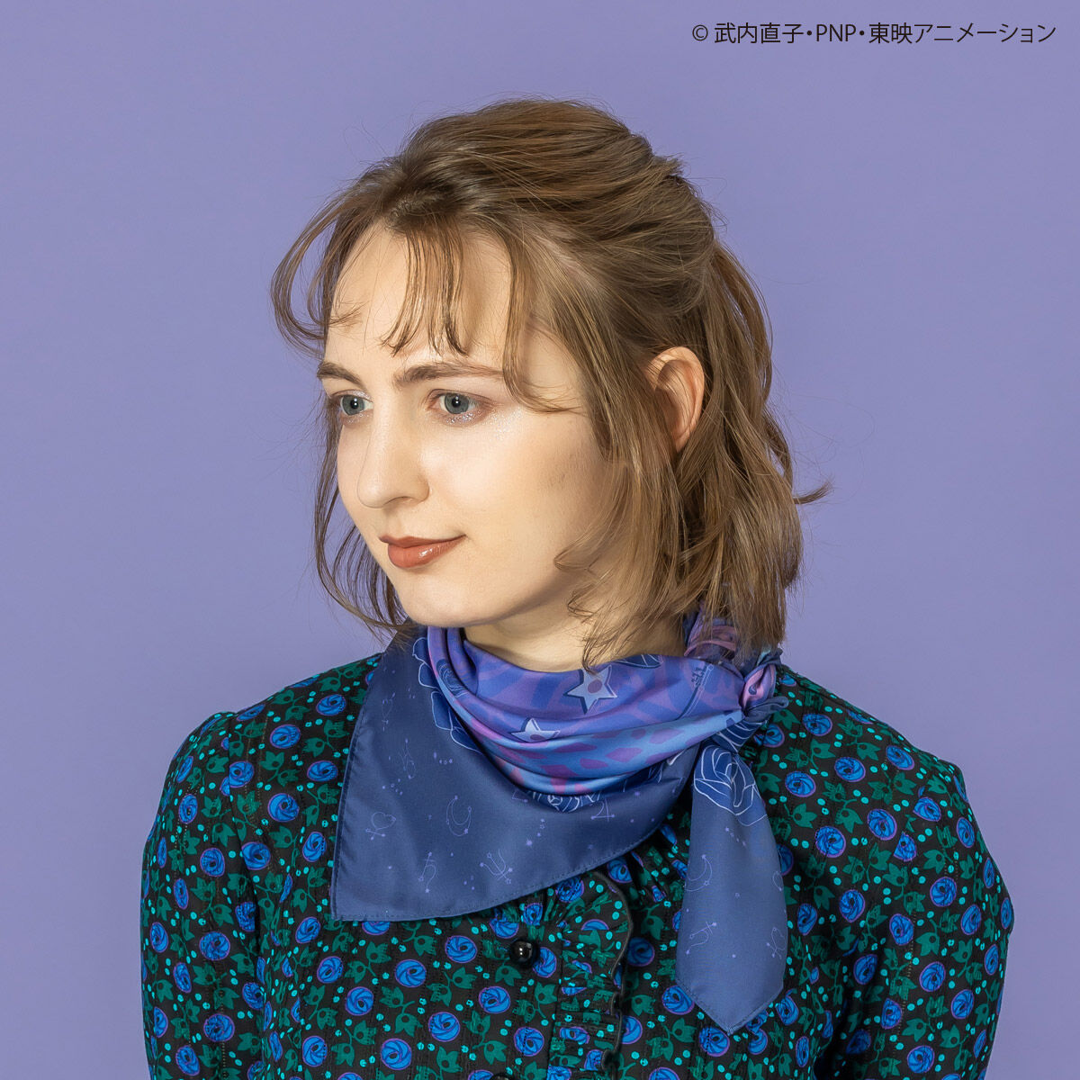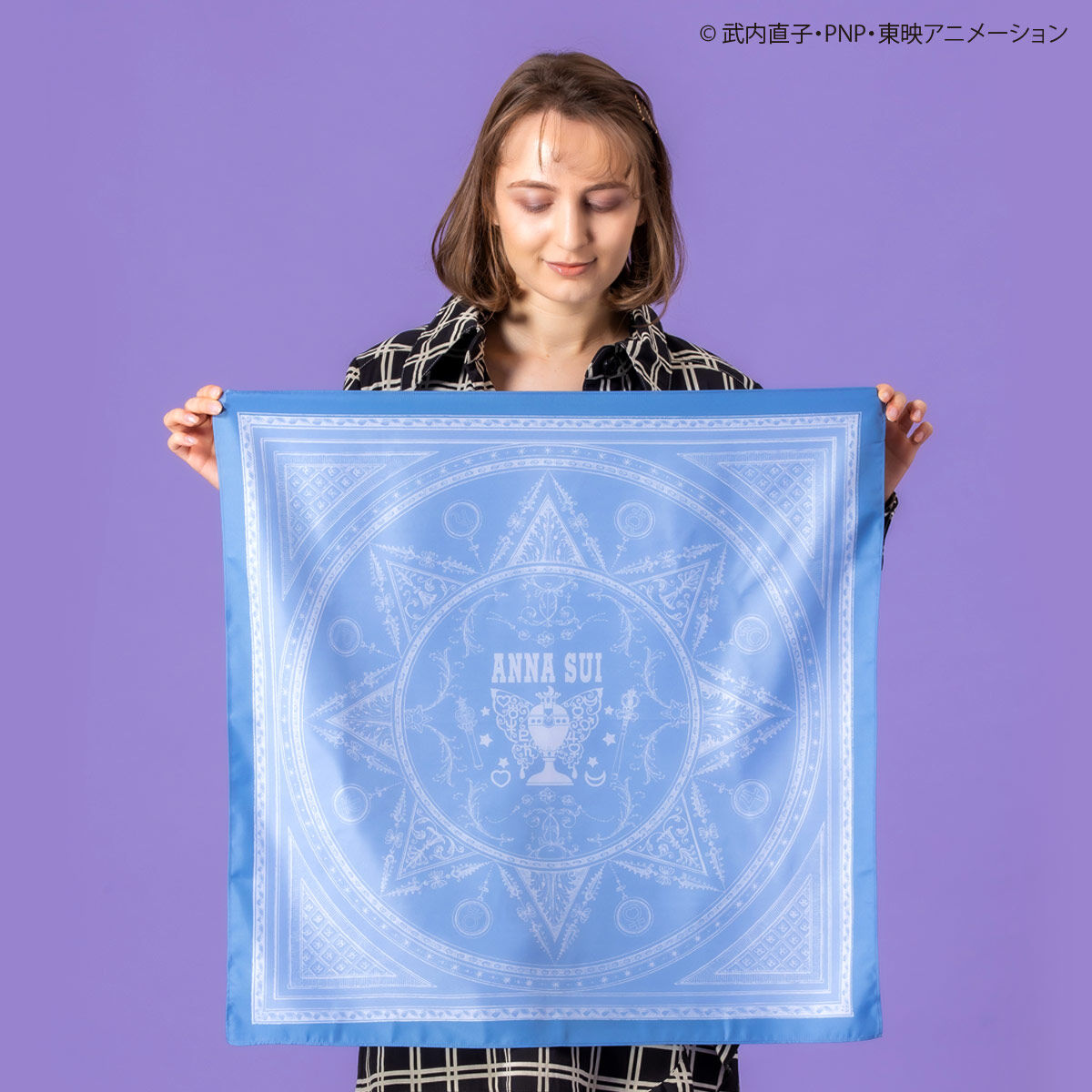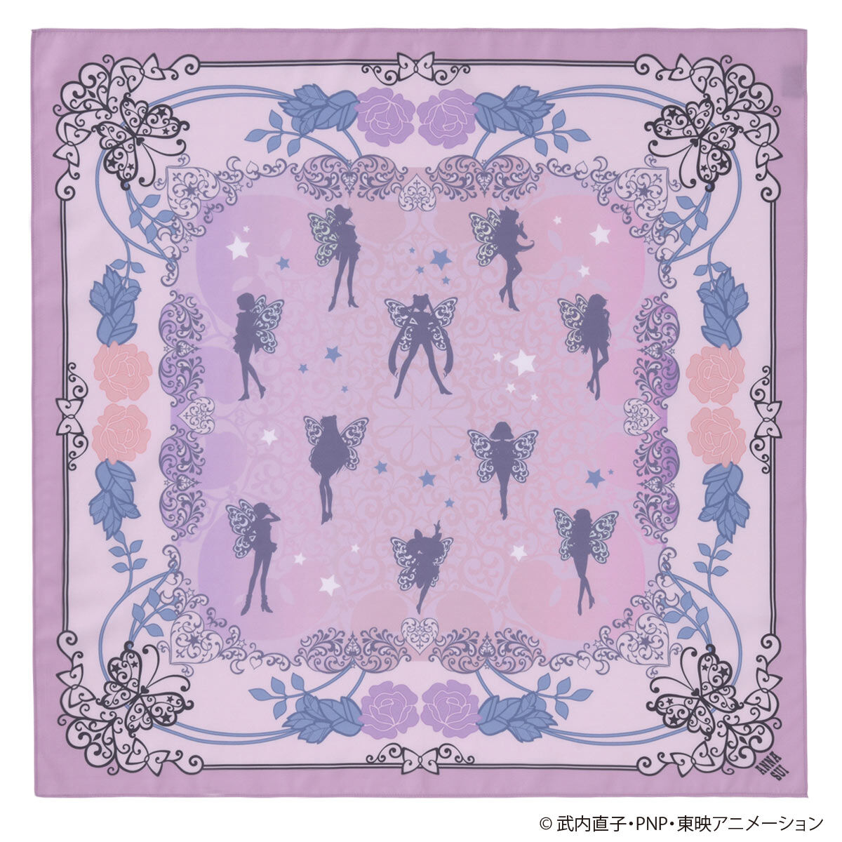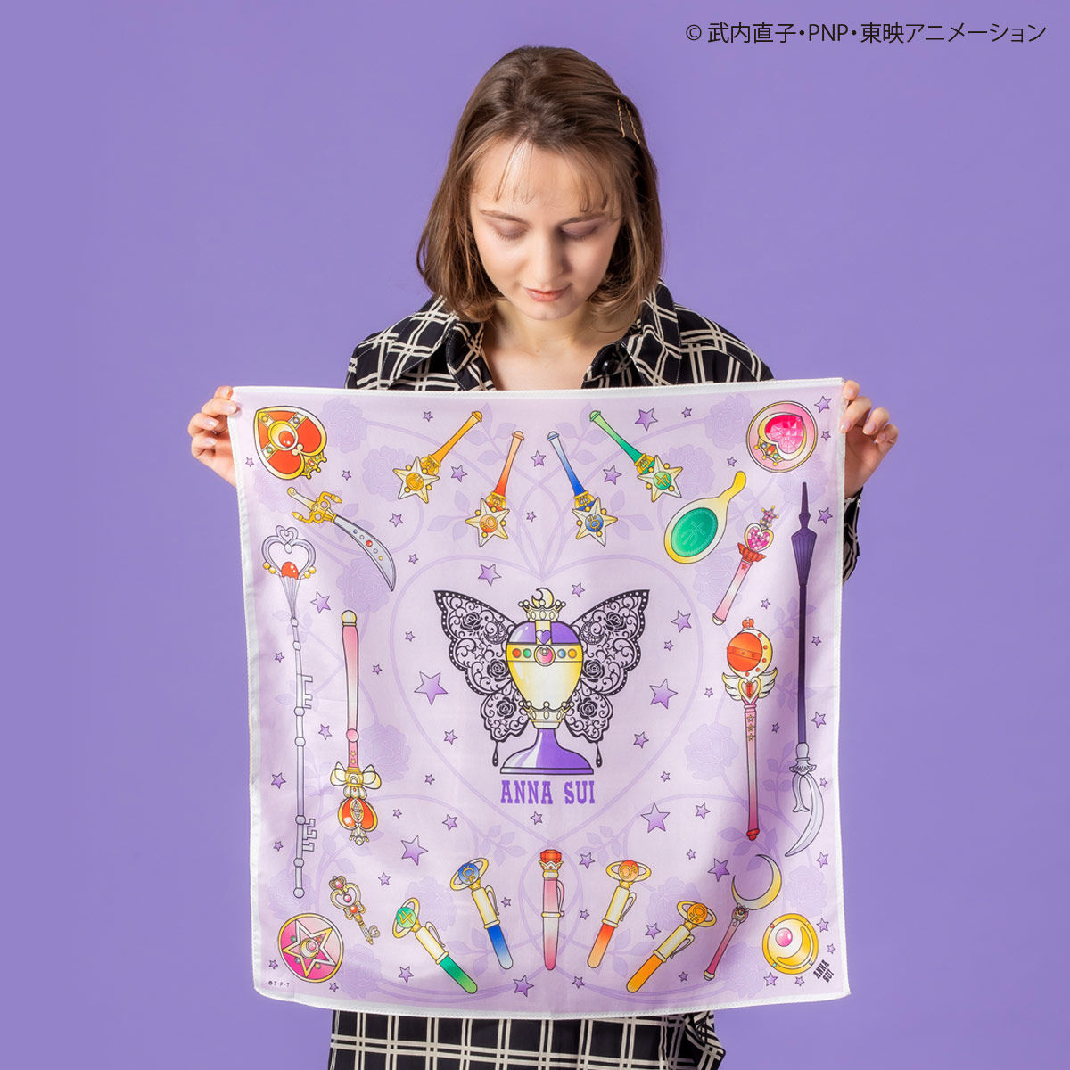 Chusteczki z nadrukiem - do wyboru 3 wzory: ze Spiral Heart Moon Rod, z magicznymi przedmiotami oraz z sylwetkami wojowniczek; wymiary to 58 x 58 cm; 2200 jenów za sztukę (ok. 75 zł).
