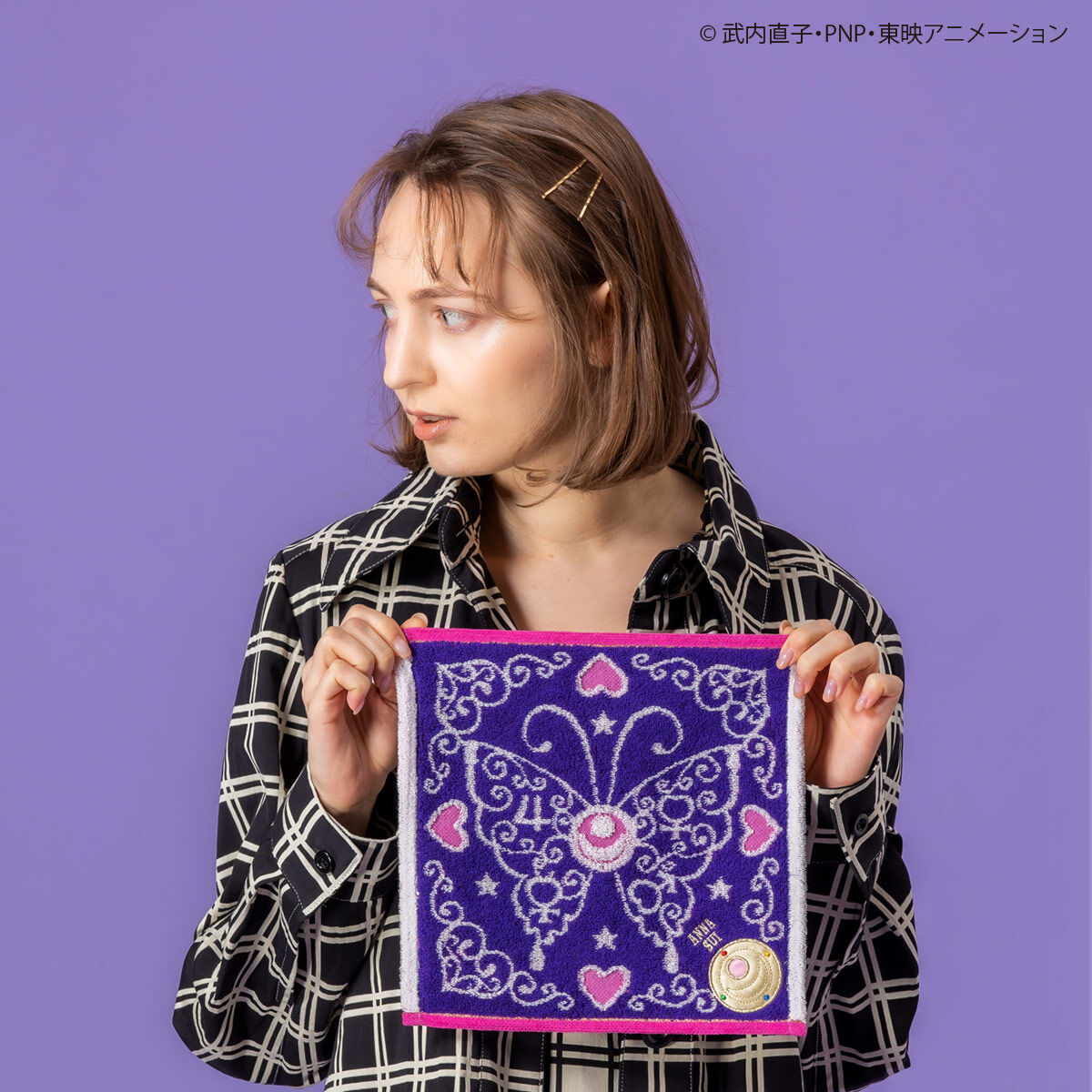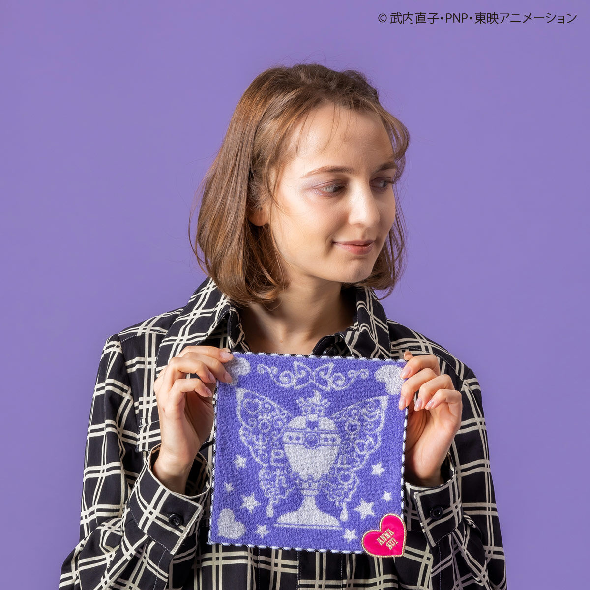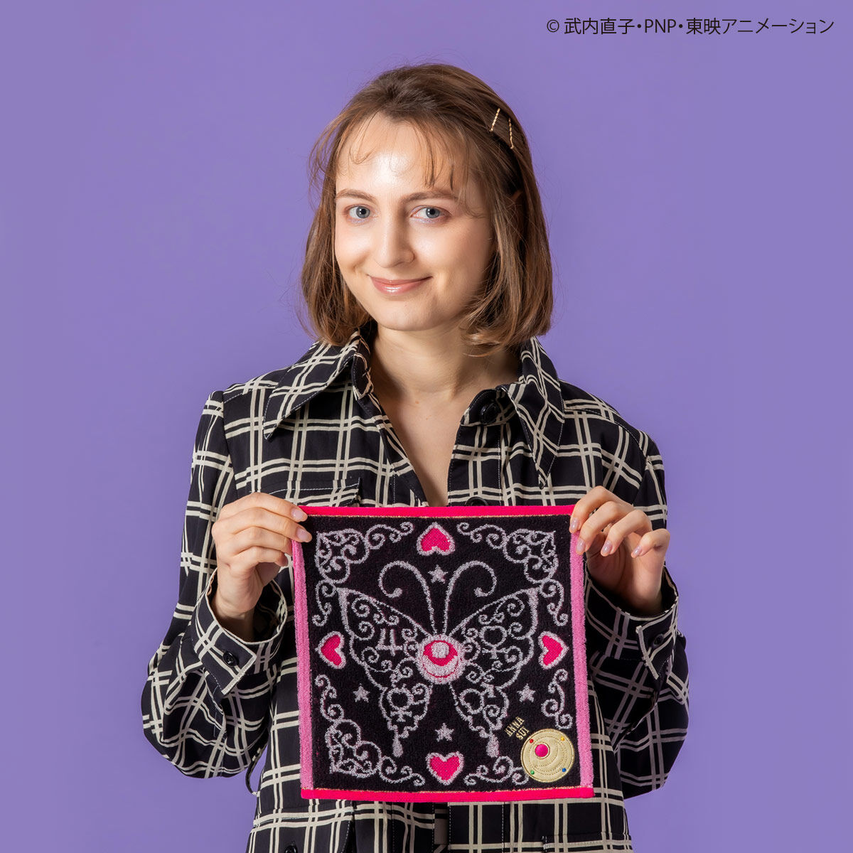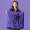 Duże ręczniki - do wyboru dwa wzory, ciemnofioletowy z motylami i berłem Spiral Heart Moon oraz różowy z sylwetkami wojowniczek; wymiary to 77 x 144 cm; 6050 jenów za sztukę (ok. 207 zł).