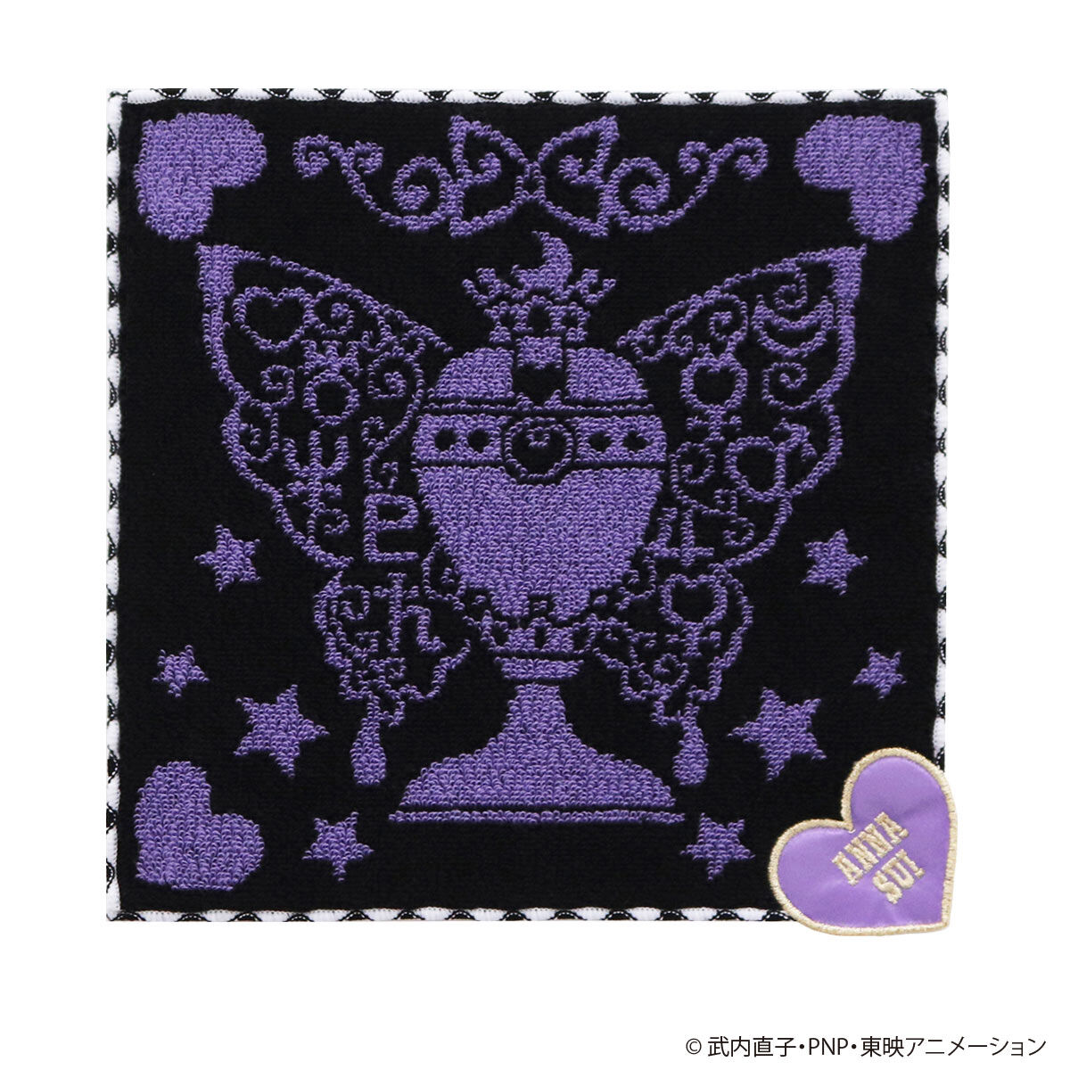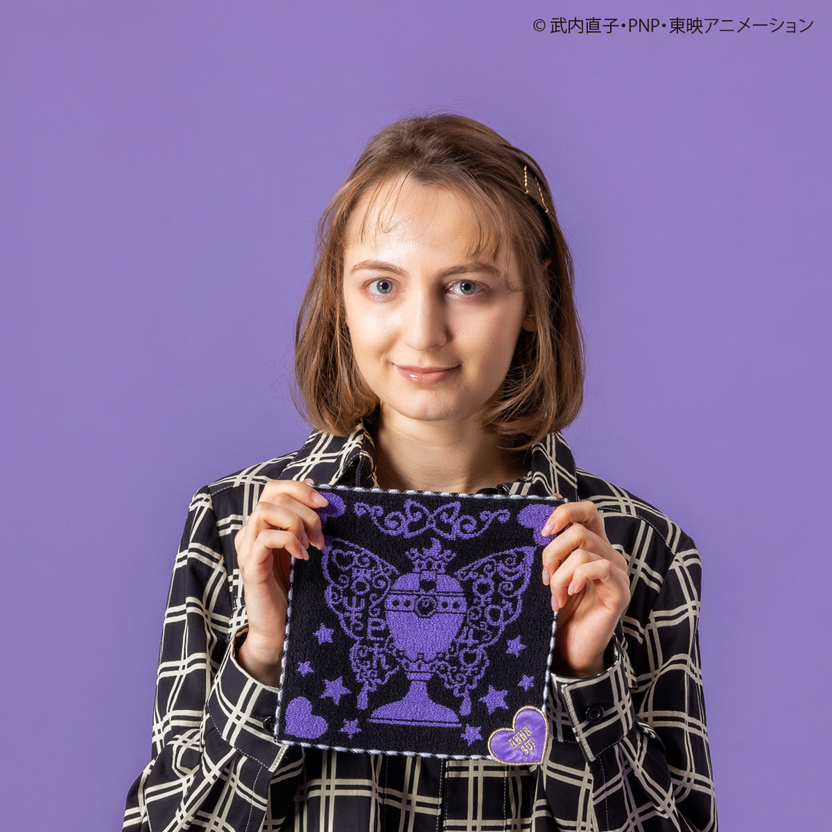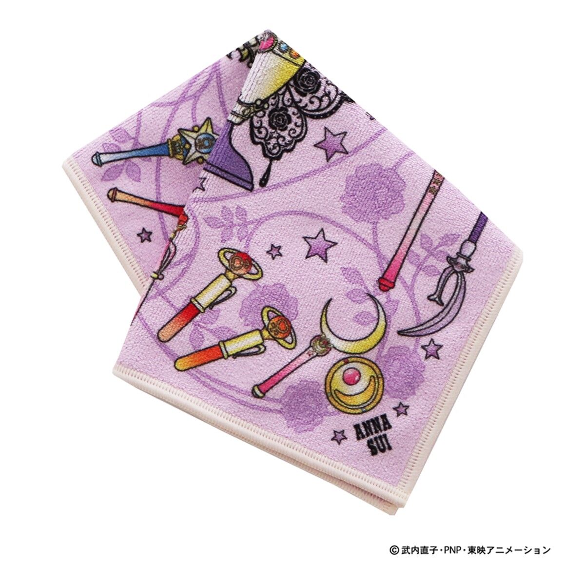 Duże ręczniki - do wyboru dwa wzory, ciemnofioletowy z motylami i berłem Spiral Heart Moon oraz różowy z sylwetkami wojowniczek; wymiary to 77 x 144 cm; 6050 jenów za sztukę (ok. 207 zł).