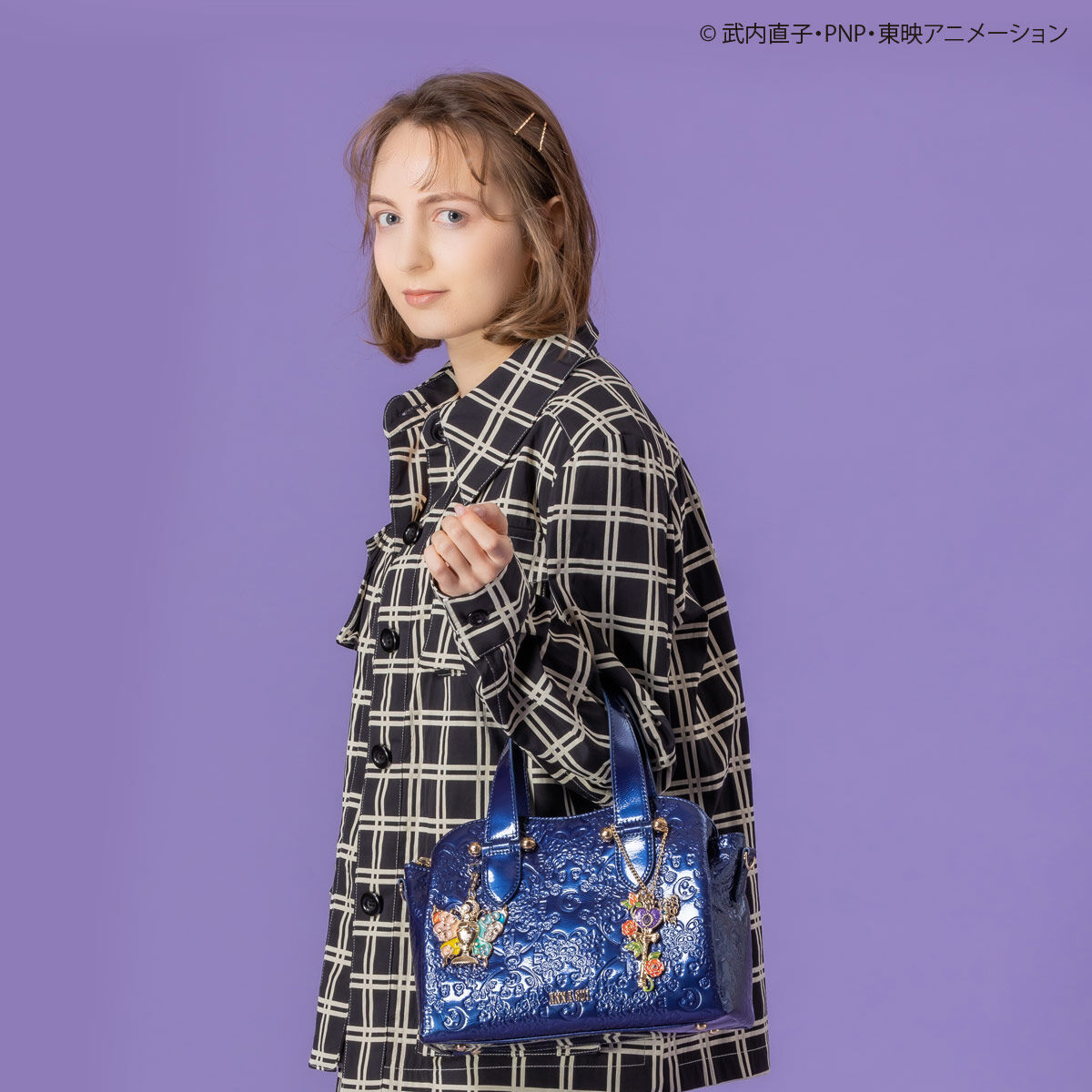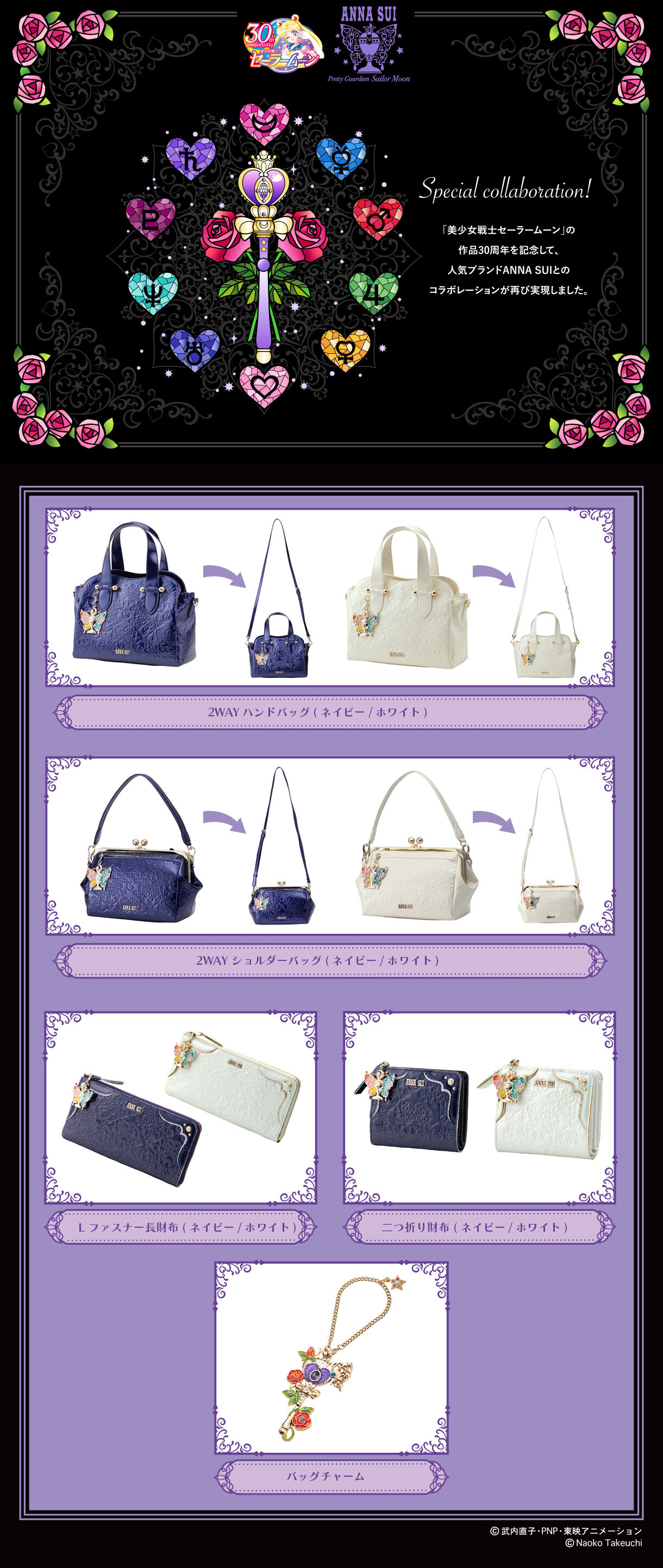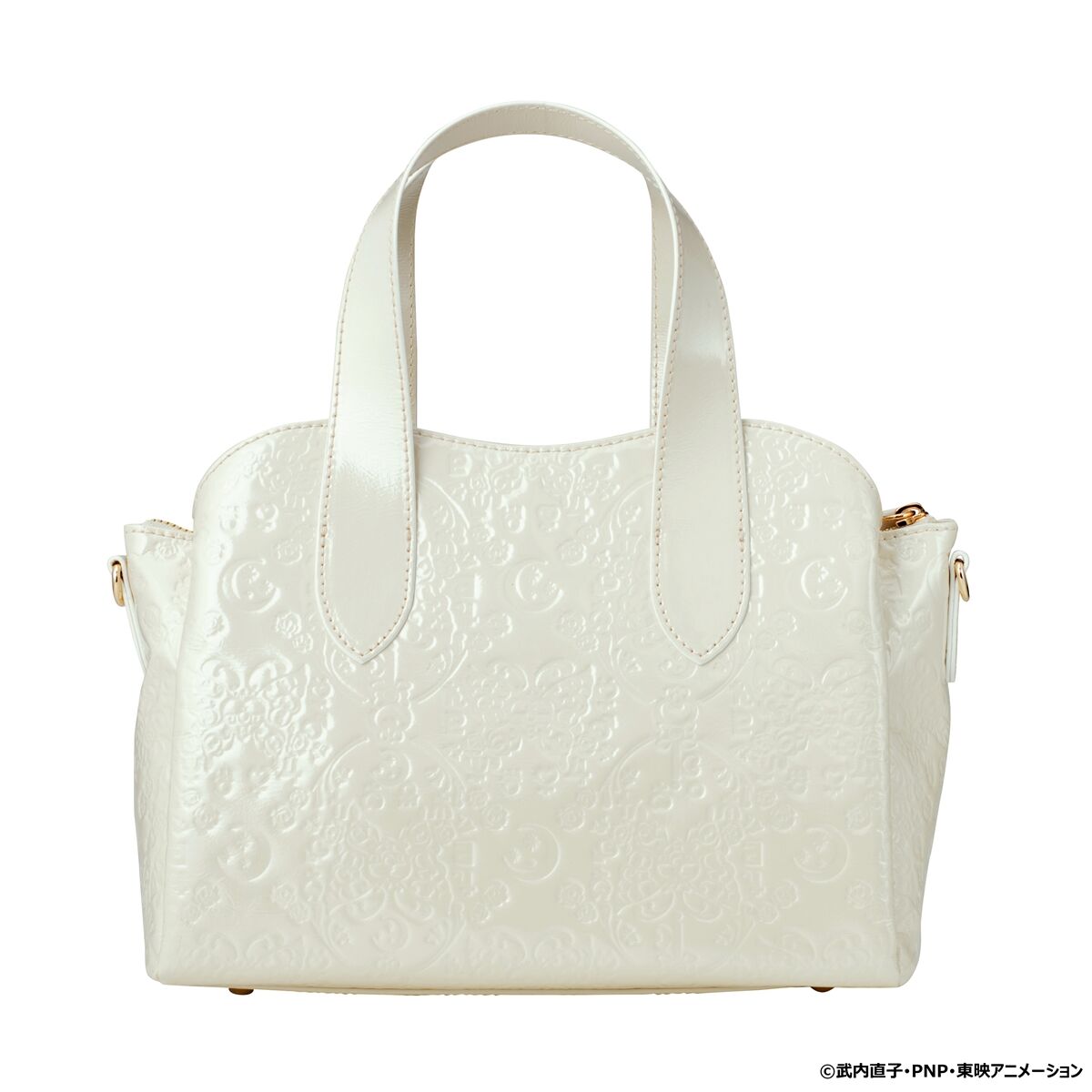 Torebka do ręki z paskiem na ramię - do wyboru granatowa lub biała; ze sztucznej lakierowanej skóry; z wytłoczeniami; 3 komory; w komplecie zawieszka z Rainbow Moon Chalice ze skrzydłami motyla; wymiary to 30 x 20 x 10 cm; 30 800 jenów za sztukę (ok.