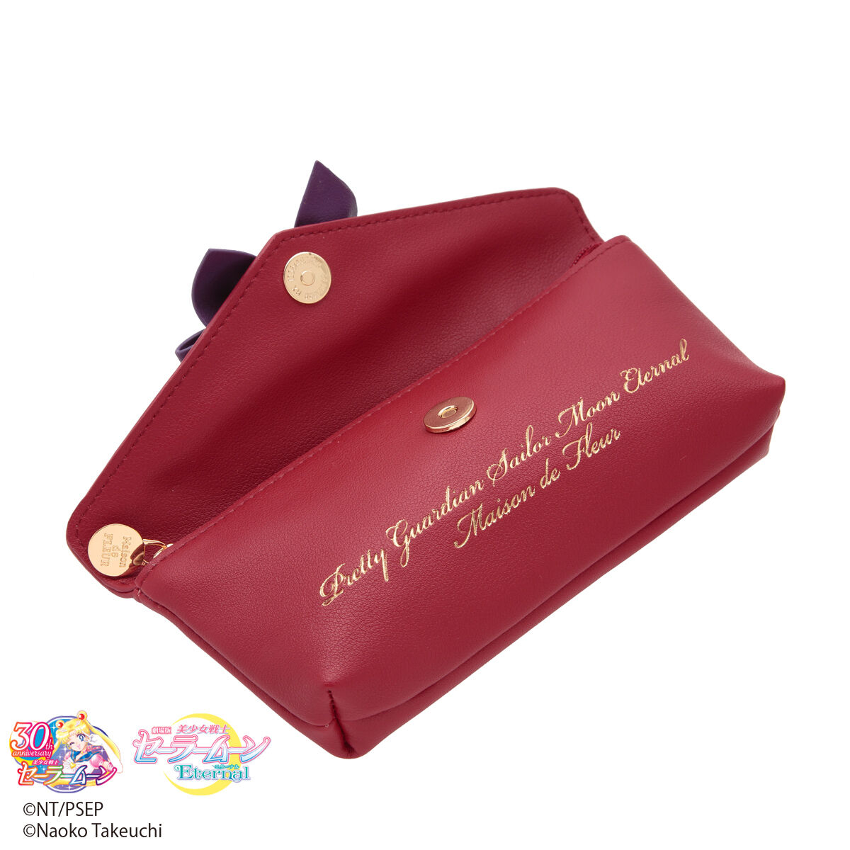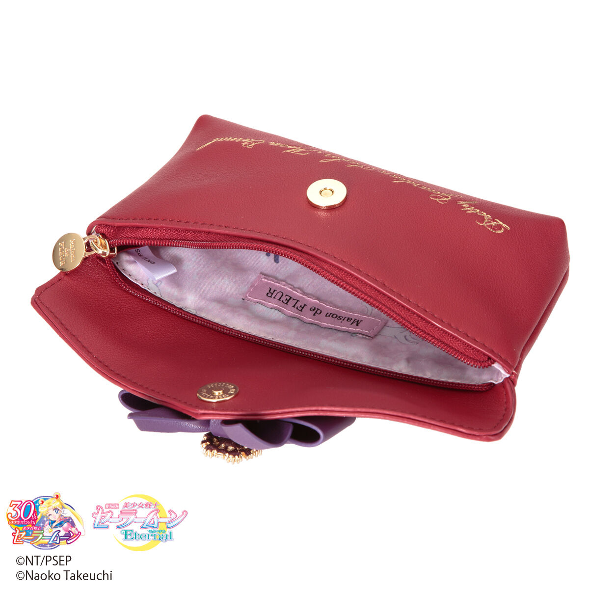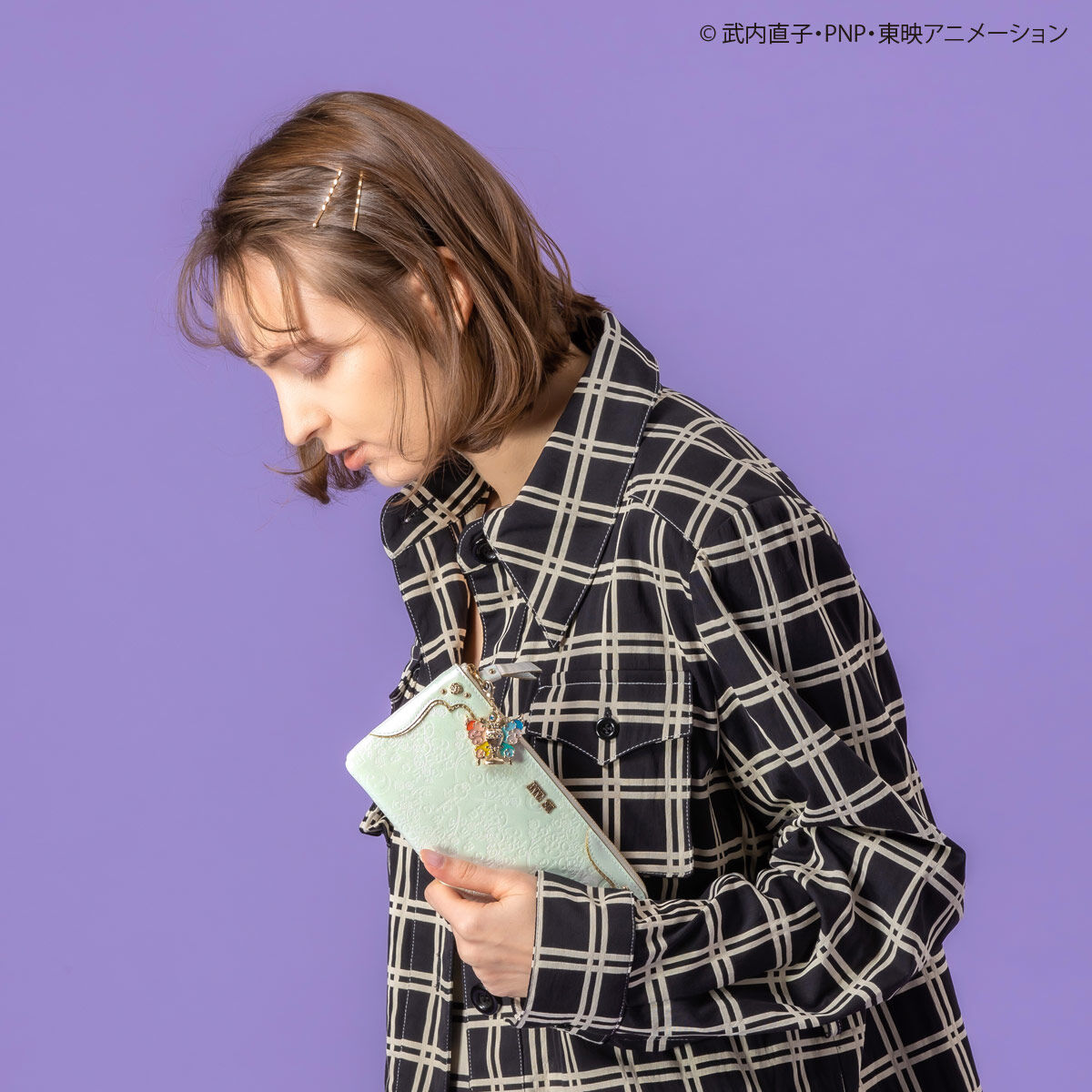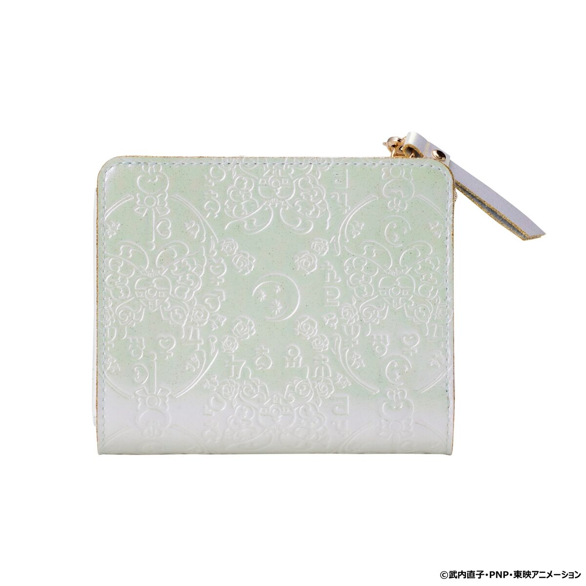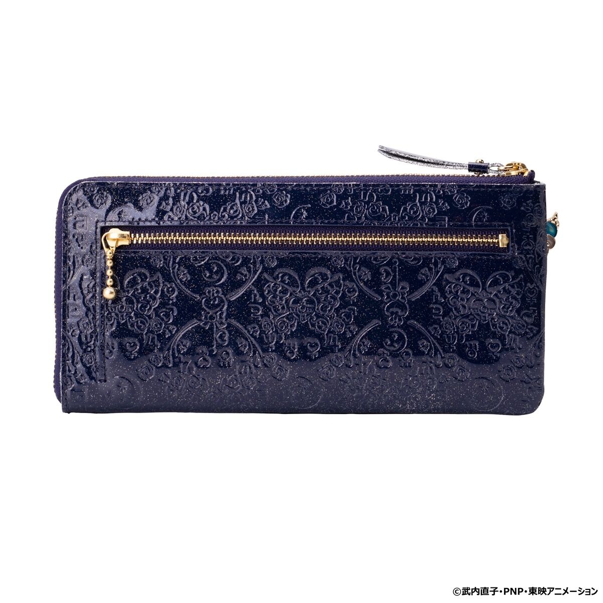 skóry; z wytłoczeniami; w środku przegródki na karty; przy ekspresie zawieszka z Rainbow Moon Chalice ze skrzydłami motyla; wymiary to 20 x 9,5 cm; 25 300 jenów za sztukę (ok. 865 zł).