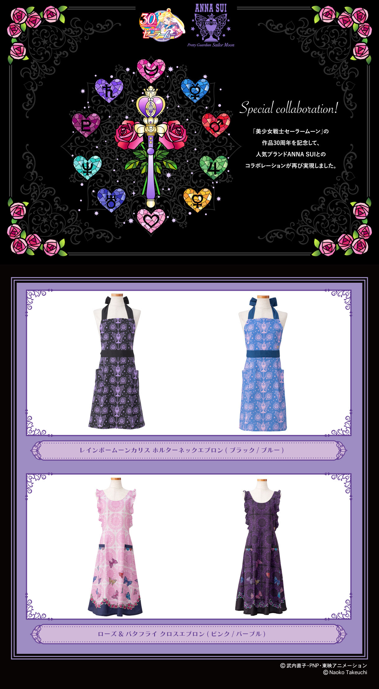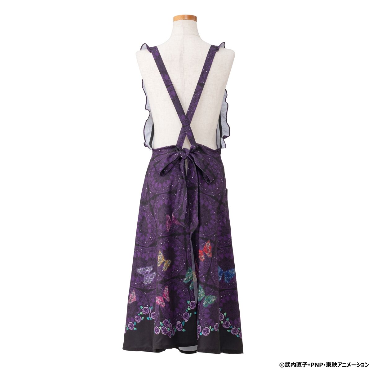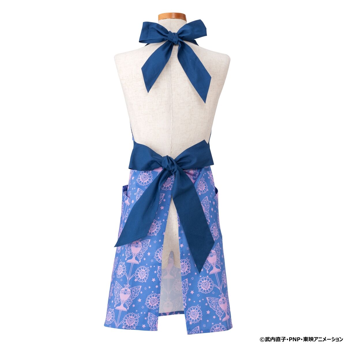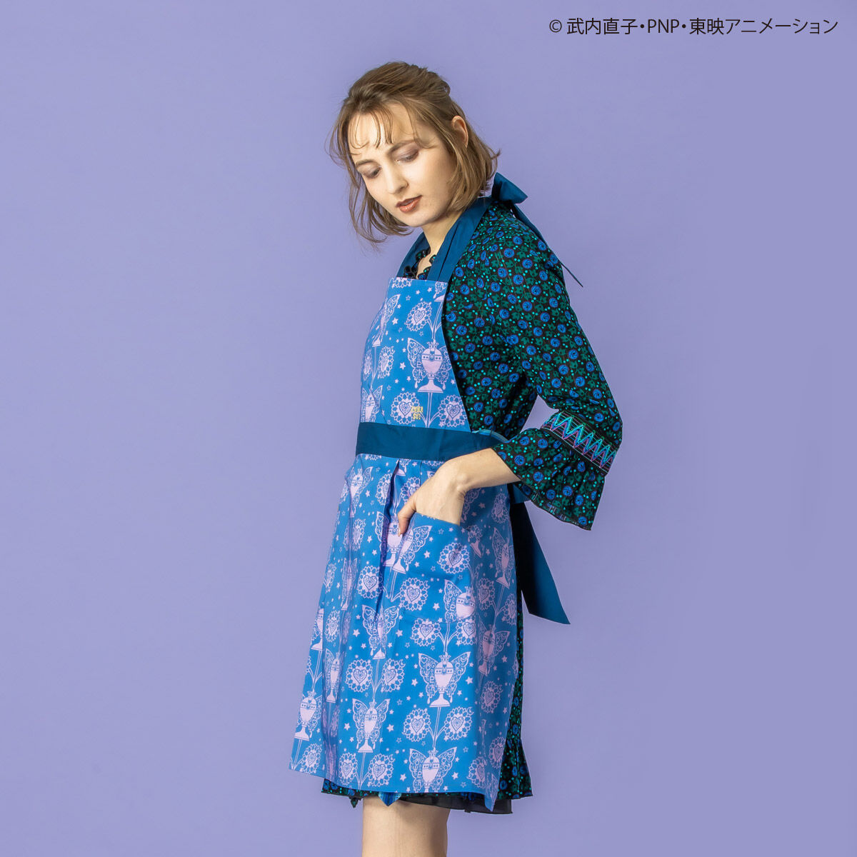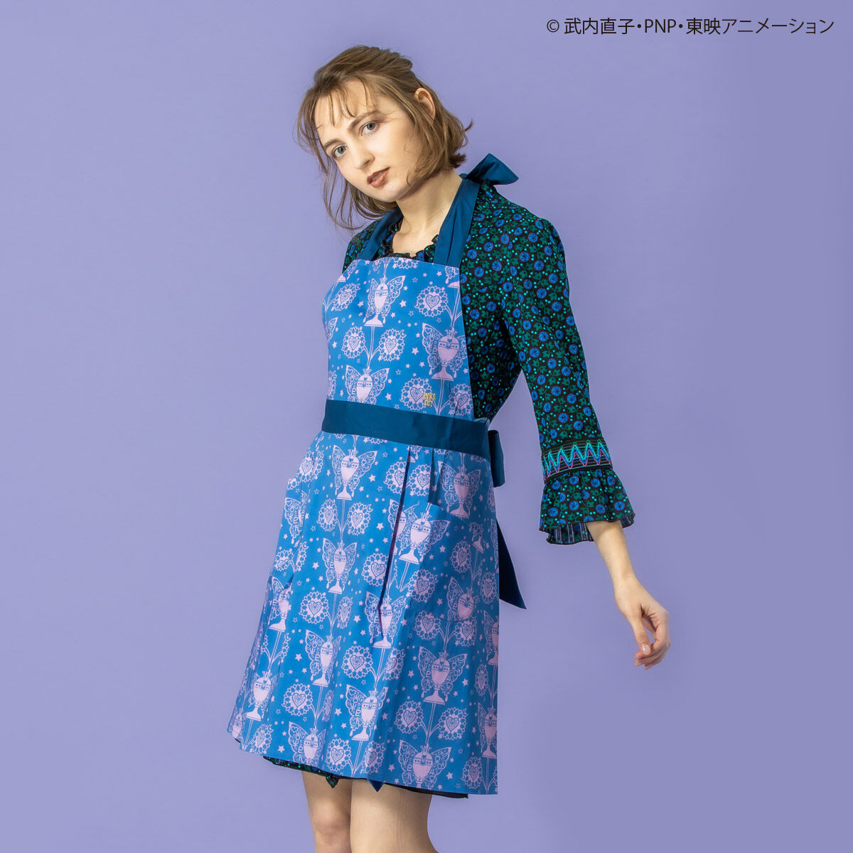Fartuch wiązany na szyi - do wyboru czarny lub niebieski; nadruk na całej powierzchni materiału w Rainbow Moon Chalice ze skrzydłami motyla; wymiary to 80 x 72 cm; 8580 jenów za sztukę (ok. 293 zł).