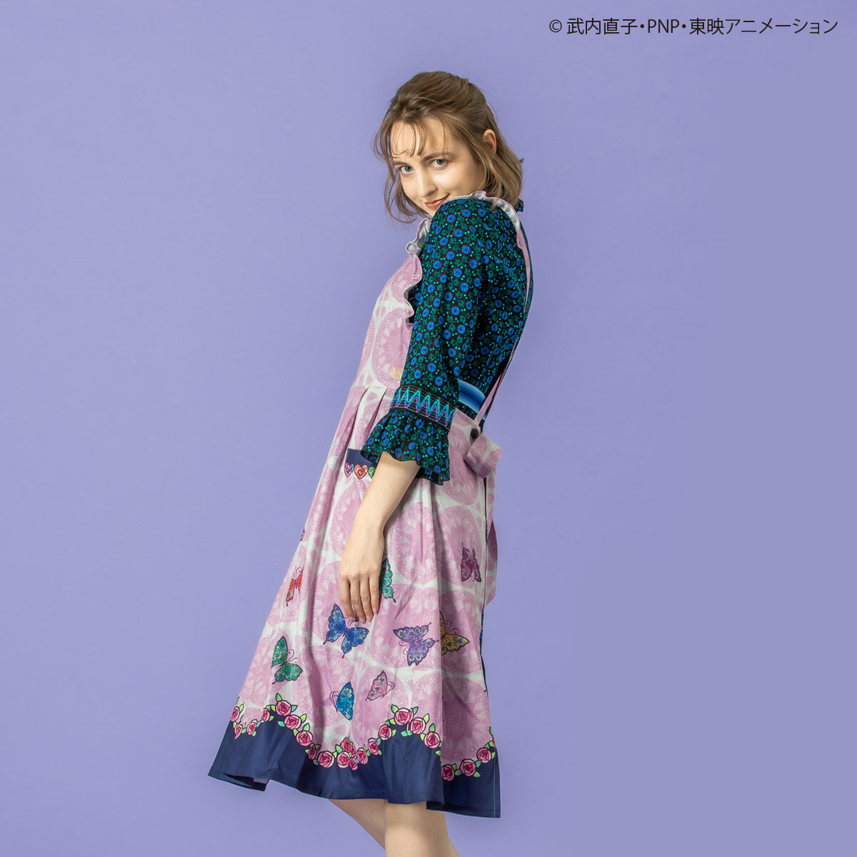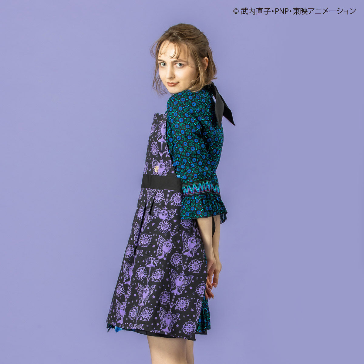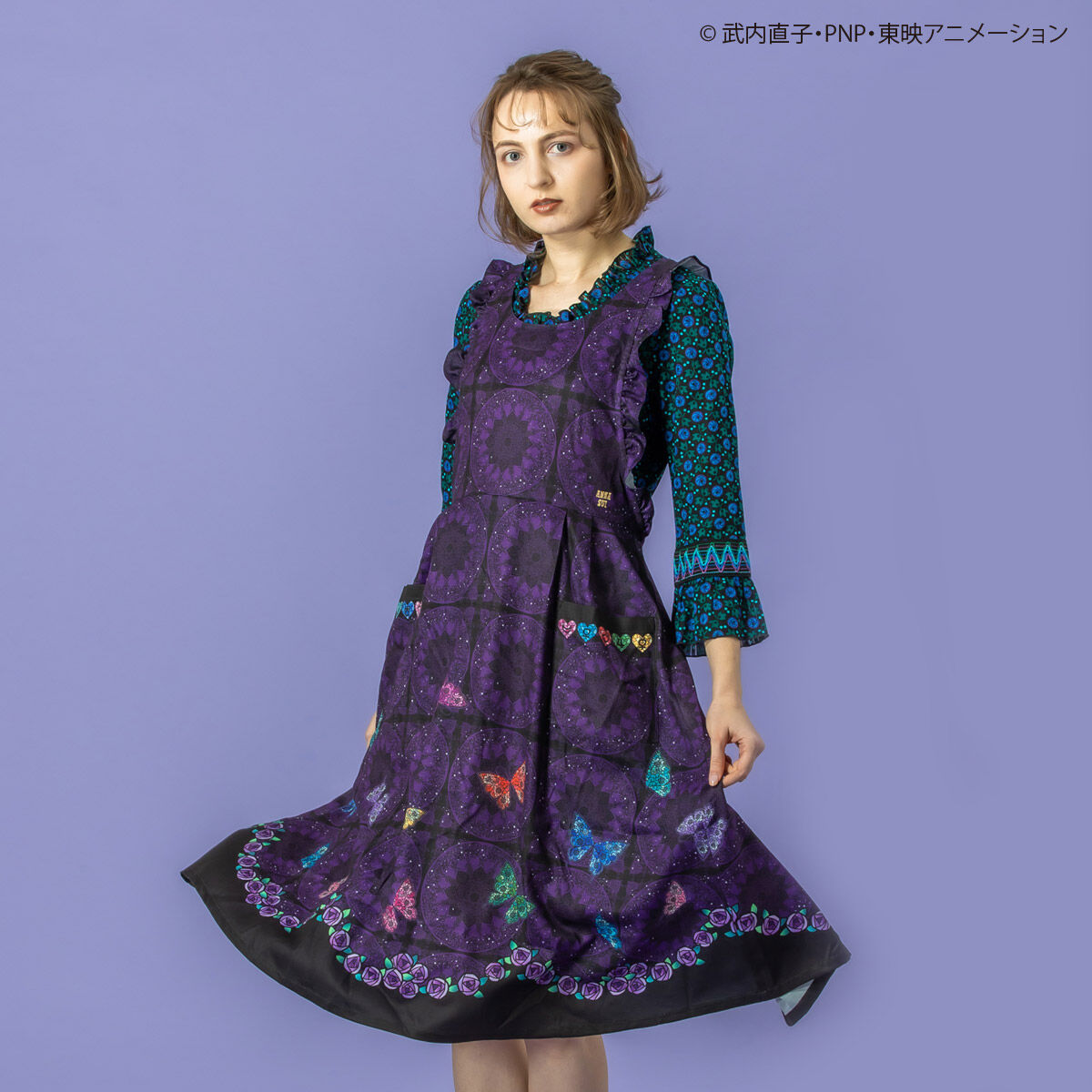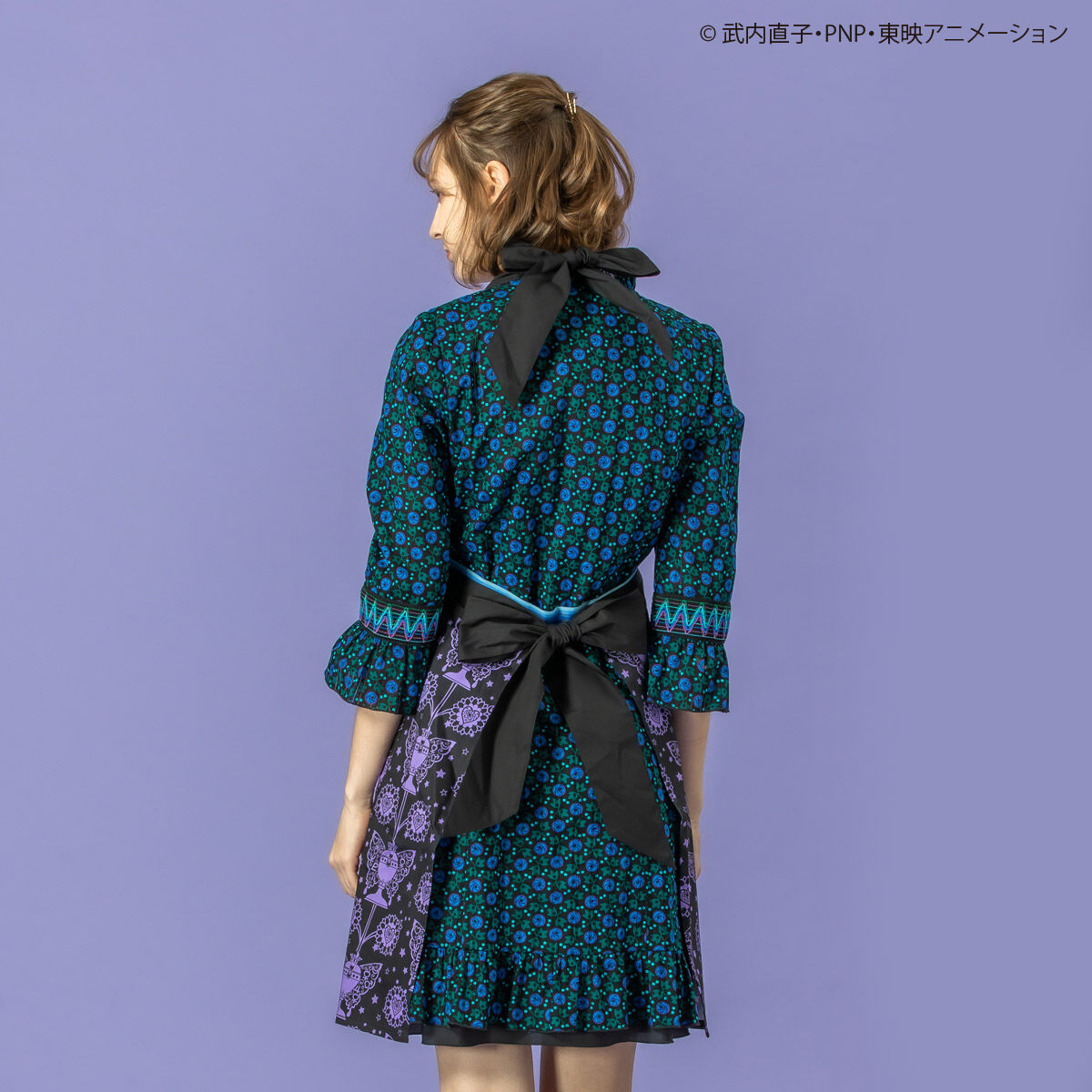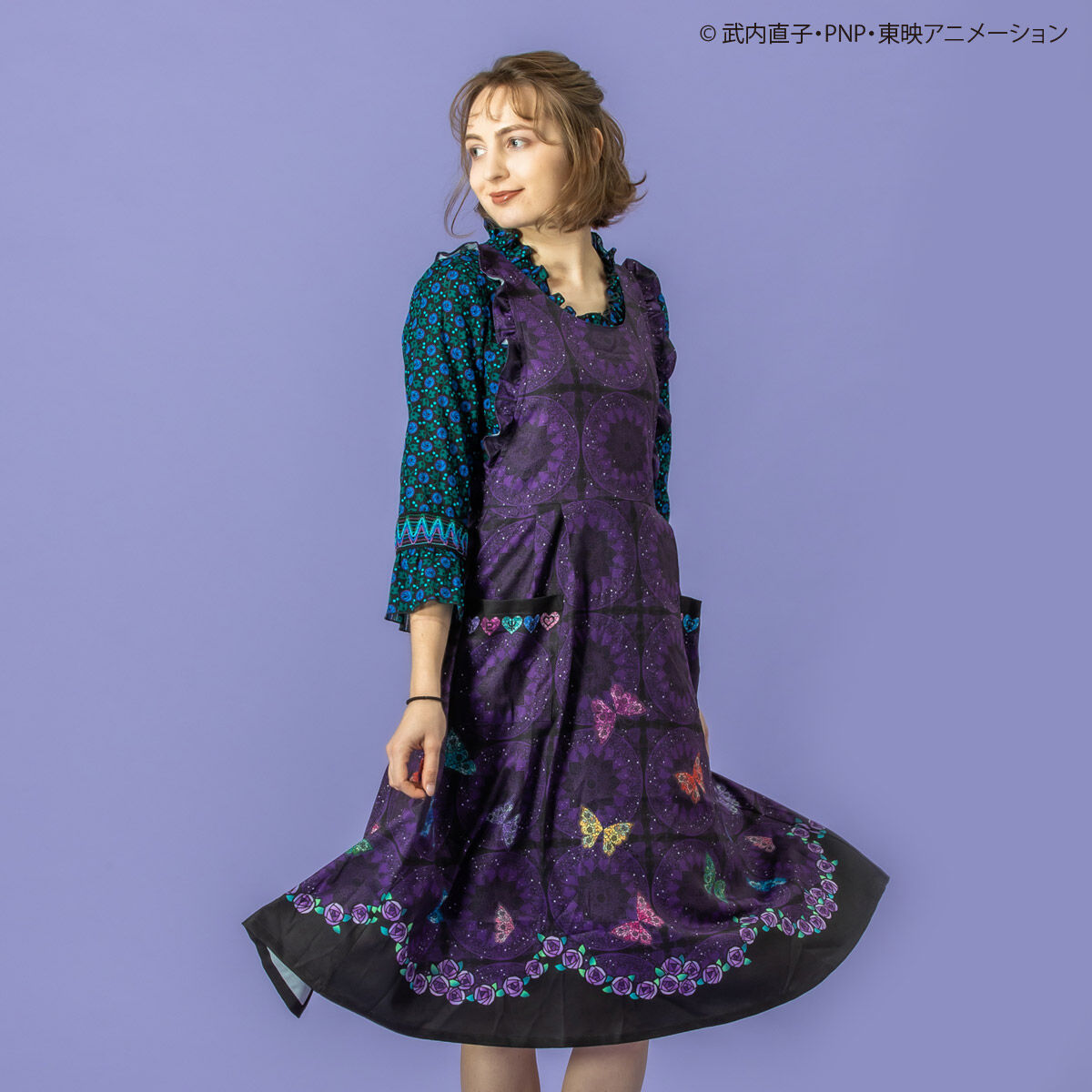 Fartuch wiązany na szyi - do wyboru czarny lub niebieski; nadruk na całej powierzchni materiału w Rainbow Moon Chalice ze skrzydłami motyla; wymiary to 80 x 72 cm; 8580 jenów za sztukę (ok. 293 zł).