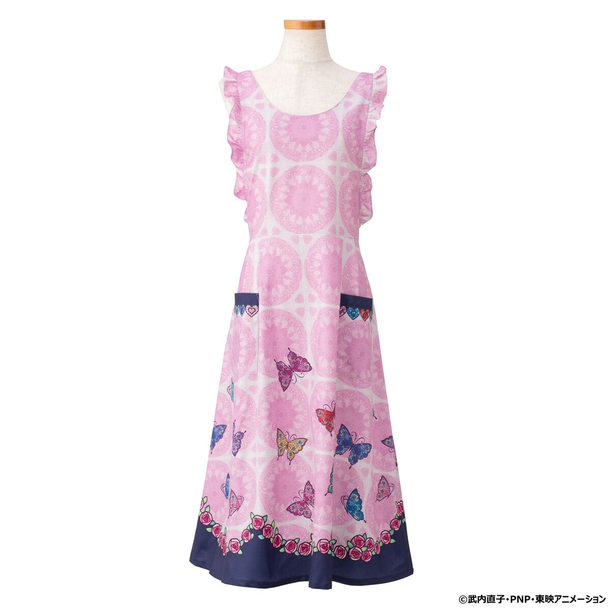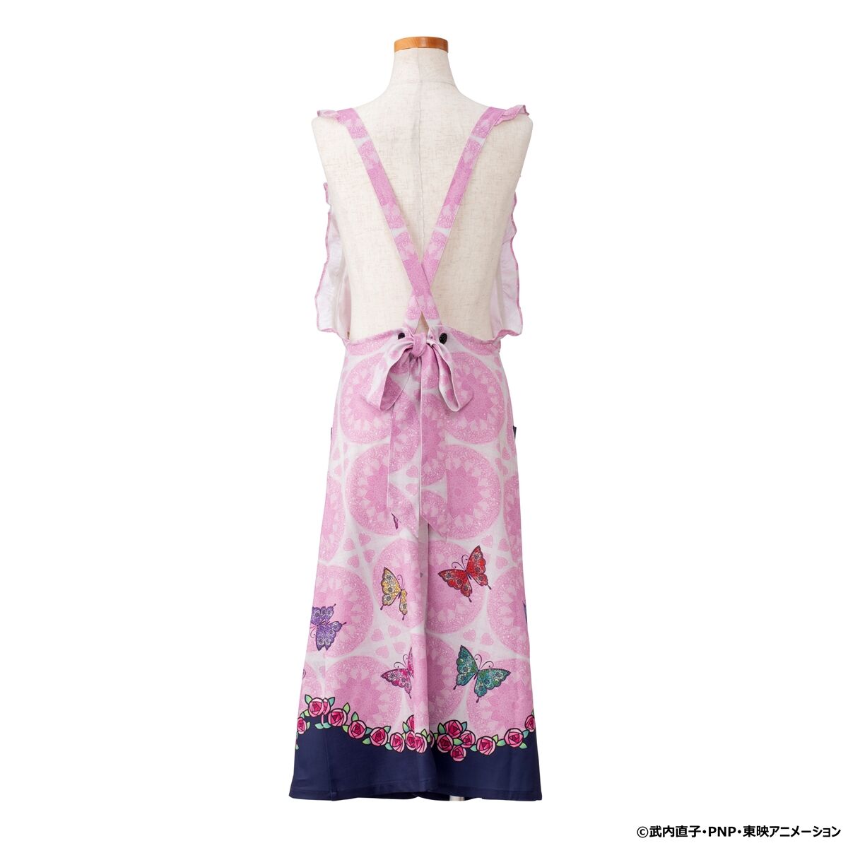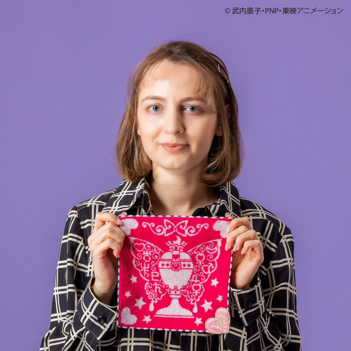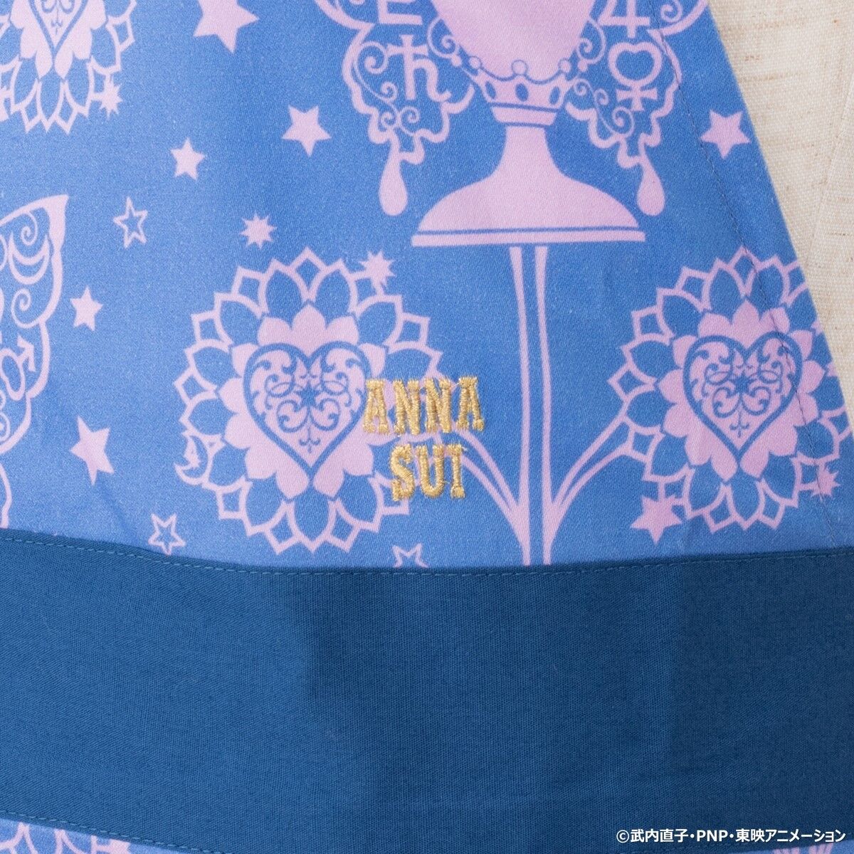 kolor różowy lub fioletowy; na materiale nadruk w motyle i róże; z przodu dwie kieszenie z nadrukiem znaków planet 10 wojowniczek; wymiary to 110 x 70 cm; 9900 jenów za sztukę (ok. 338 zł).