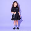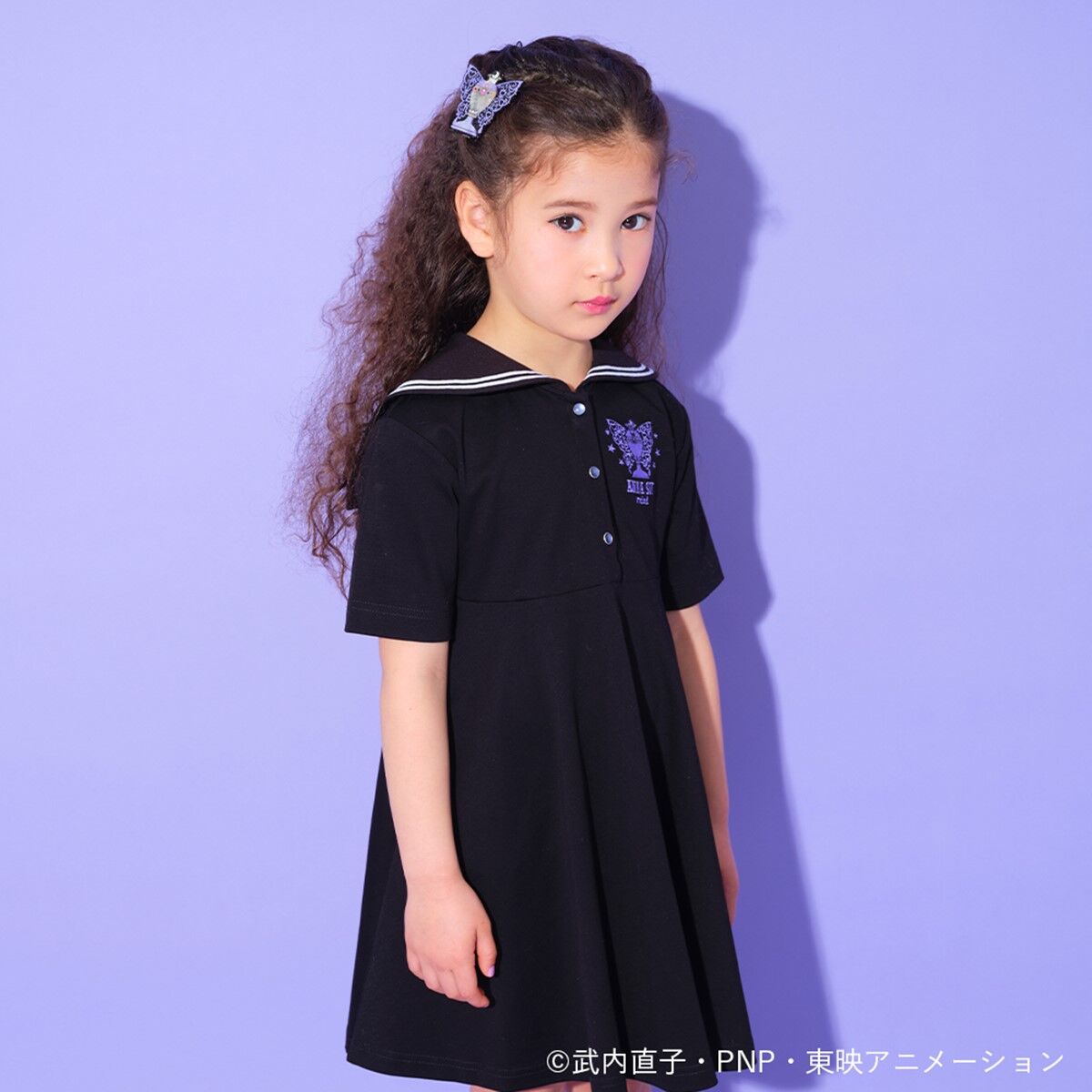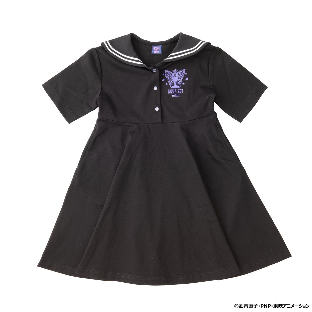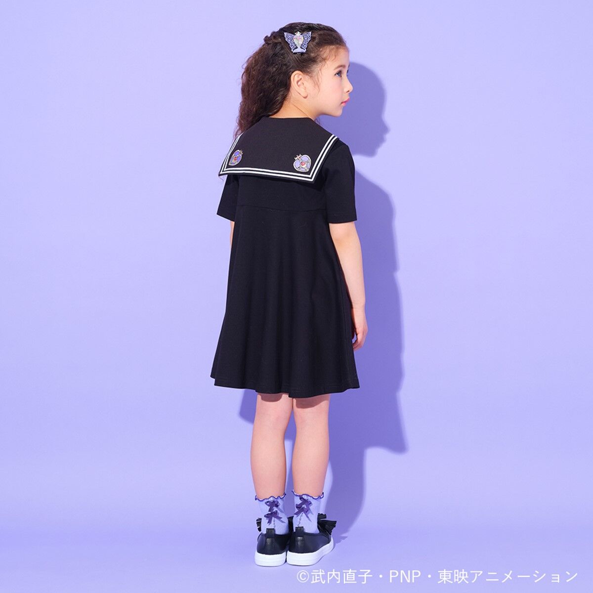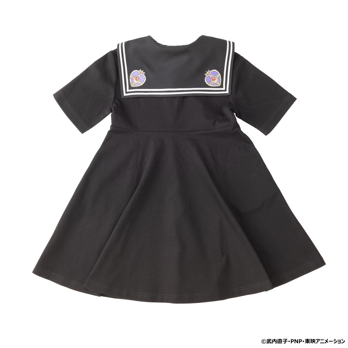 Mini sukienki - prosta czarna sukienka z kołnierzykiem jak w mundurku wojowniczki; z przodu aplikacja z Rainbow Moon Chalice ze skrzydłami motyla, a z tyłu na kołnierzyku broszka