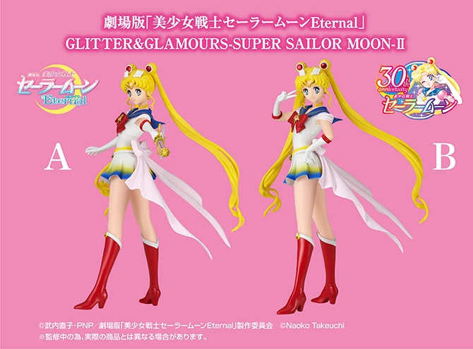 W lipcu pojawią się nowe figurki Super Sailor Moon w serii Glitter & Glamours. Dostępne będą dwie wersje, A z Moon Kaleidoscope oraz B bez pałeczki i w innej pozie. Figurki to wersja Super Sailor Moon z filmów Eternal.