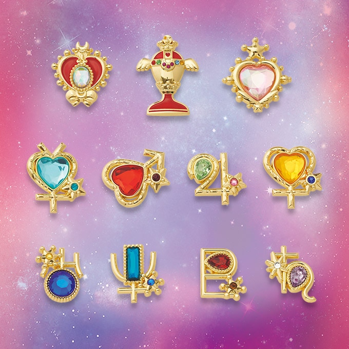 Zestaw wsuwek - w zestawie 5 sztuk: z berłem Spiral Heart Moon Rod, z broszką Cosmic Heart Compact, z Luną, z napisem Sailor Moon oraz z półksiężycem; 2600 jenów (ok. 91 zł).