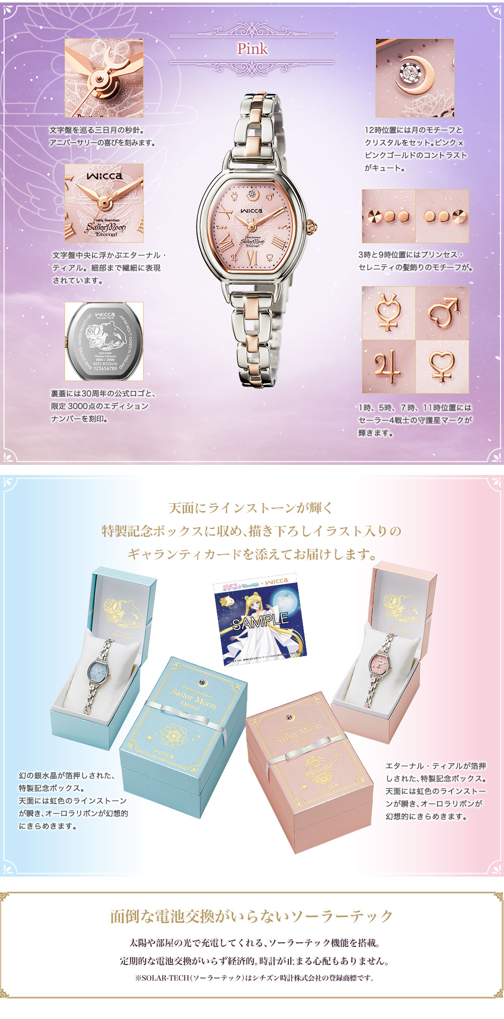 jest berłem Eternal Tiare. Łączniki bransolety oraz obwódka wokół tarczy jest w kolorze różowego złota, a na tarczy pojawiają się także znaki planet inner senshi. Każdy zegarek ma swoje własne ozdobne pudełko. Wymiary tarczy to 24,5