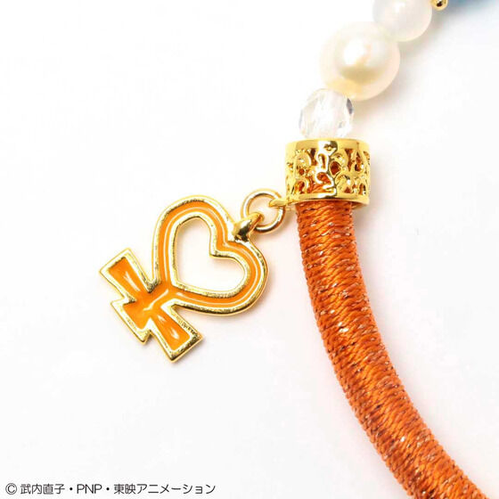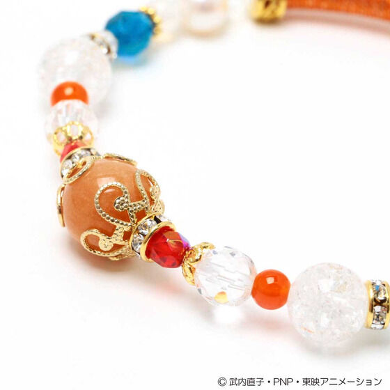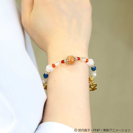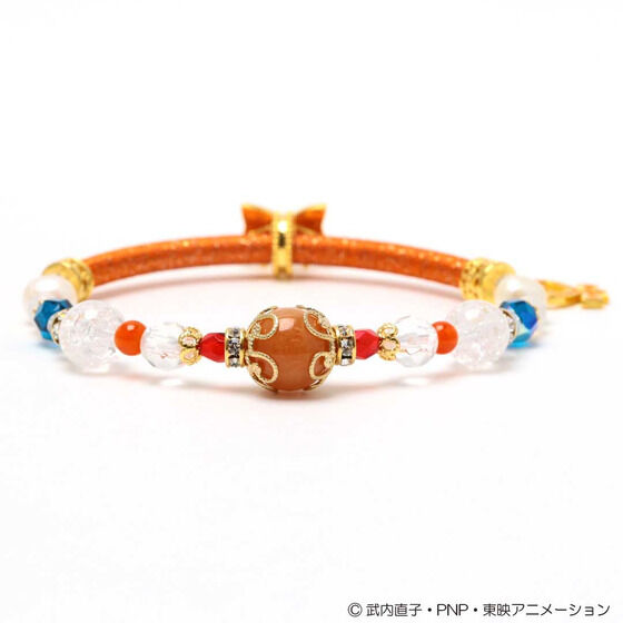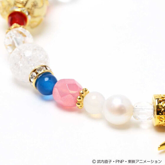 Bransoletka Sailor Venus zawiera pomarańczowy awenturyn, kryształ, kwarc trzaskany, karneol, perły oraz biały agat.
