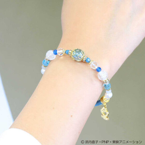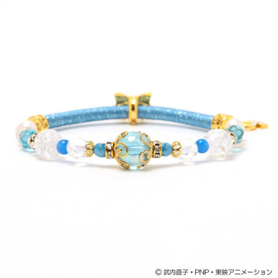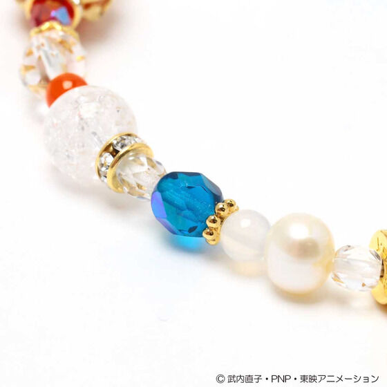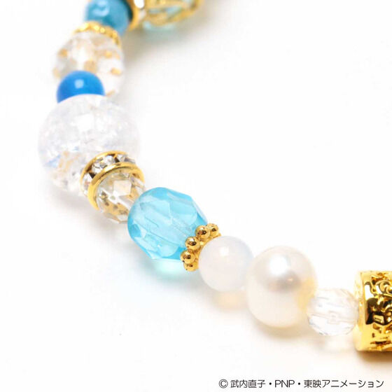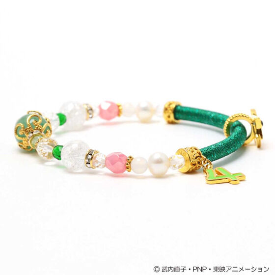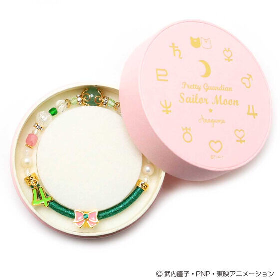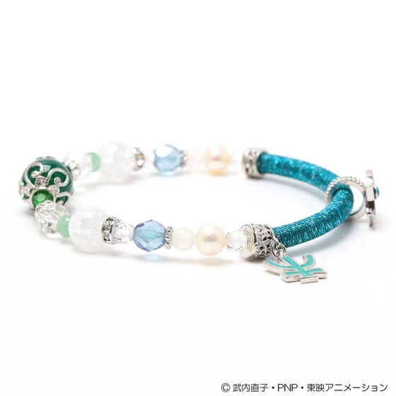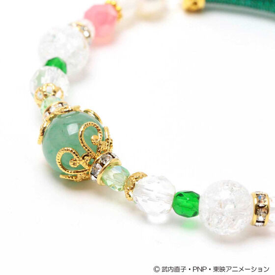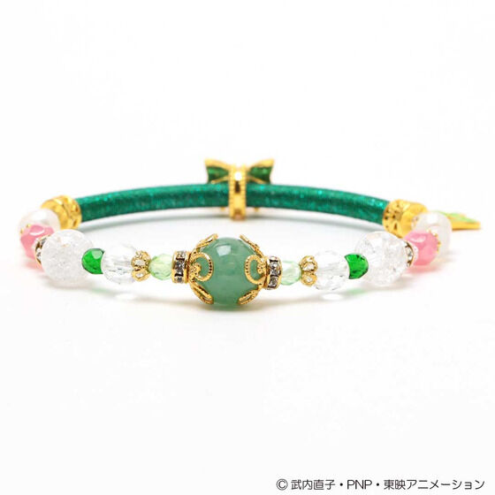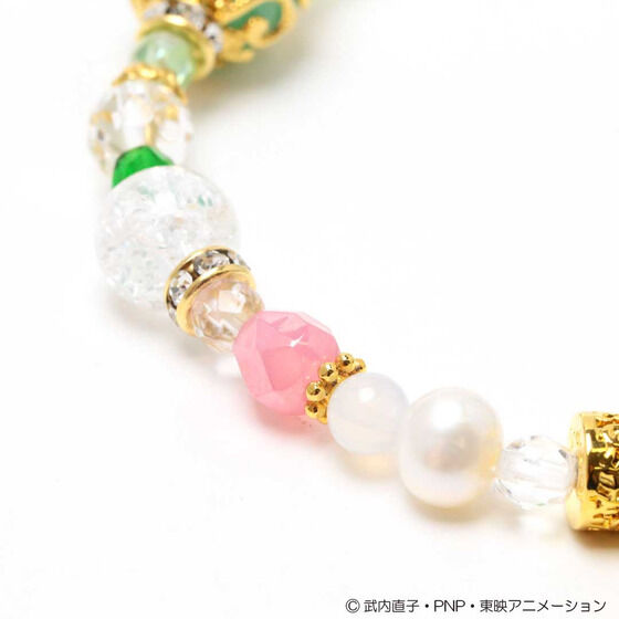 Bransoletka Sailor Jupiter zawiera awenturyn, kryształ, kwarc trzaskany, perły oraz biały agat.