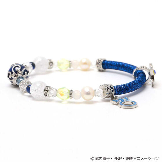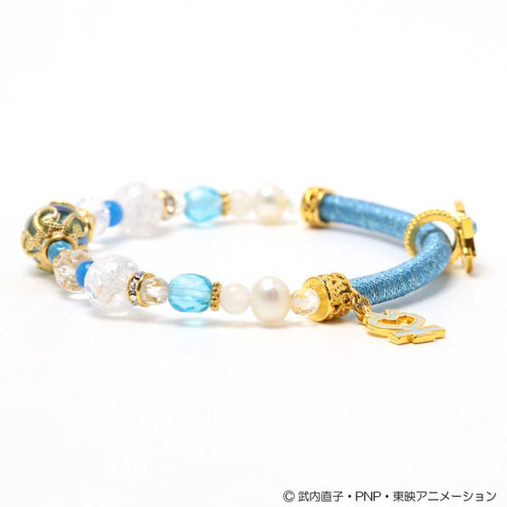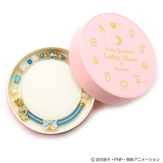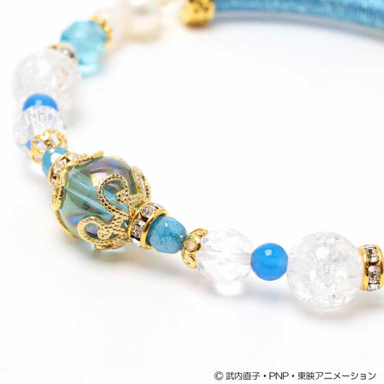 Bransoletka Sailor Mercury zawiera kwarc aqua aura, kryształ, kwarc trzaskany, niebieski i biały agat i perły.