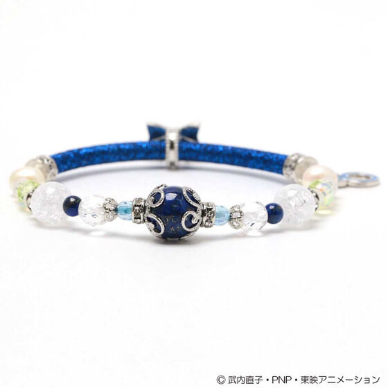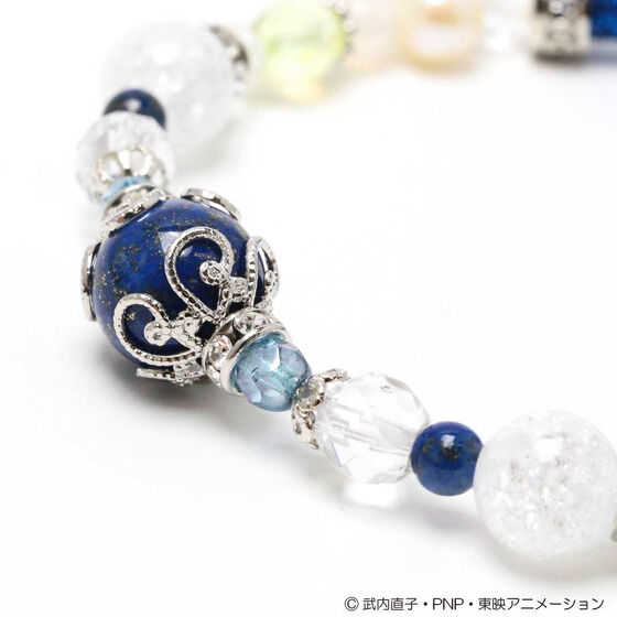 Bransoletka Sailor Uranus zawiera lapis lazuli, kryształ, kwarc trzaskany, perły i biały agat.