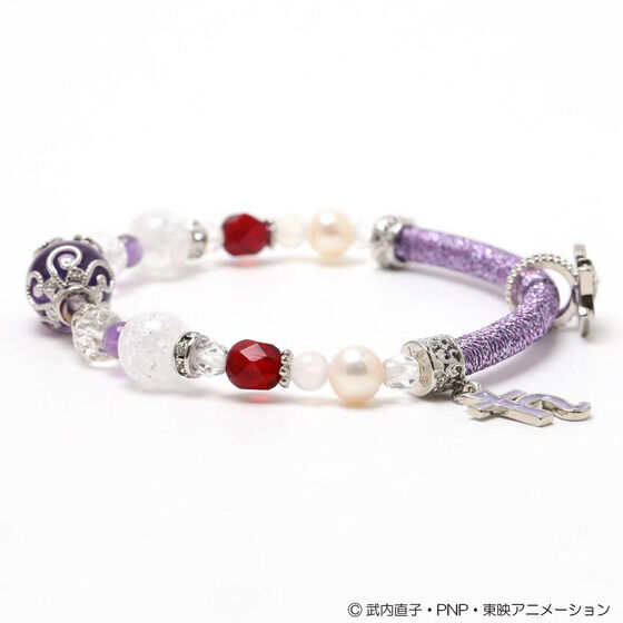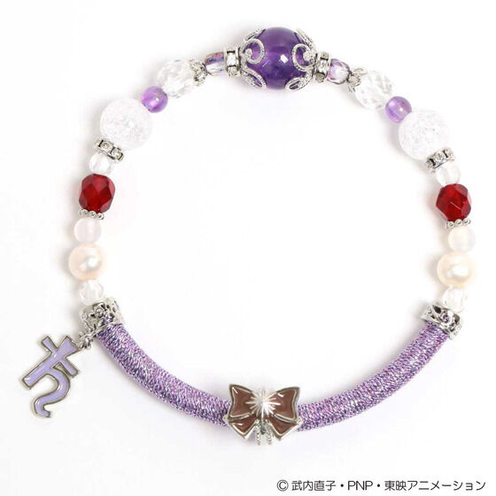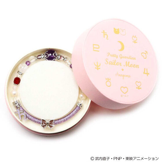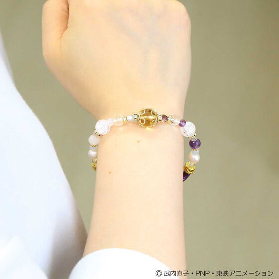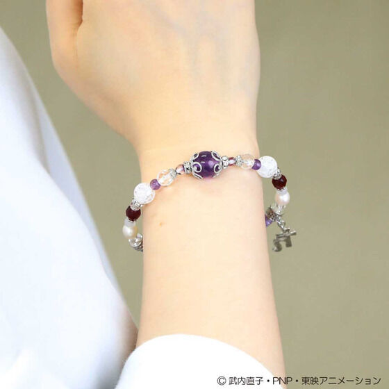 Bransoletka Sailor Saturn zawiera fioletowy i biały ametyst, kryształ, kwarc trzaskany oraz perły.