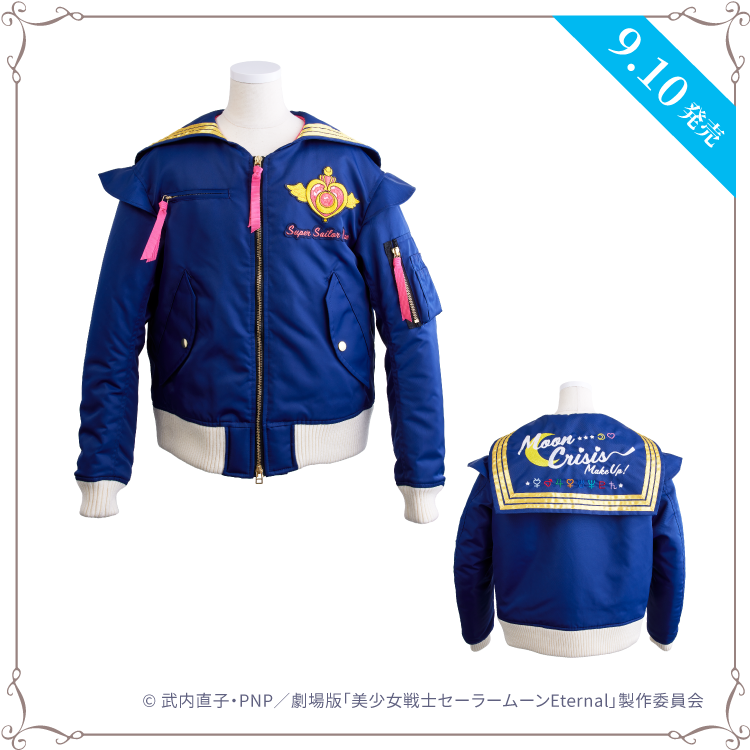 Granatowa kurtka z marynarskim kołnierzem - artykuł tylko na zamówienie; z przodu aplikacja z broszką Crisis Moon Compact; 139 700 jenów