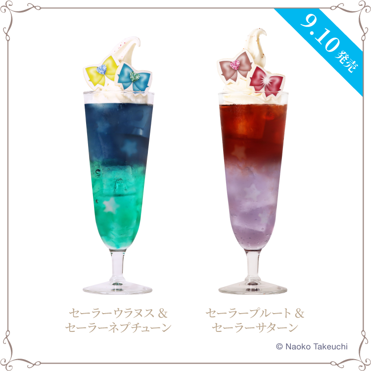 Sailor Senshi no Pair Soda Float - dwa napoje inspirowane parami Uranus/Neptune oraz Pluto/Saturn; 950 jenów (ok. 33 zł).
