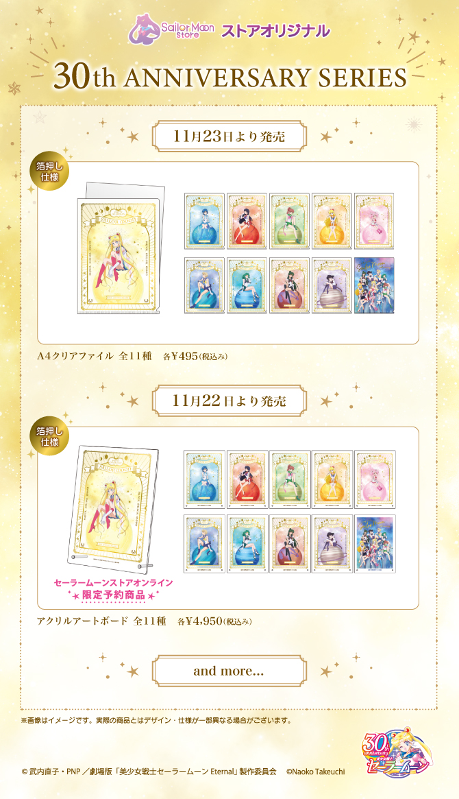 się 23 listopada w Sailor Moon Museum, Sailor Moon Store i Sailor Moon Store Petit; w Sailor Moon Store Online będą sprzedawane od 21 listopada (Pretty Guardians) i od 24 listopada (regularni klienci); 495 jenów (ok. 16 zł) za sztukę. Acrylic Artboard - ozdobione złotą folią na obramowaniach i logo; do uzbierania 11 wzorów, po jednym z każdą wojowniczką i jeden z ilustracją zbiorową; dostępne będą jedynie w Sailor Moon Store Online; przedsprzedaż rozpocznie się