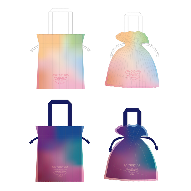 13 zł) za zestaw. Przezroczyste arkusze z postaciami - wycinane laserowo; sprzedawane tylko w teatrze; sprzedawane losowo; wymiary to 70 x 100 mm; 400 jenów (ok. 13 zł) za sztukę. Torby na zakupy - z możliwością zamknięcia ściąganym