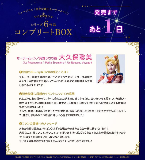 Na Twitterze rozpoczęło się odliczanie do wydania zestawu i przez kolejne trzy pojawią się komentarze od aktorek grających Sailor Moon. Dzisiaj komentarz Tanaki Riko z musicalu Kaguya Hime no Koibito.