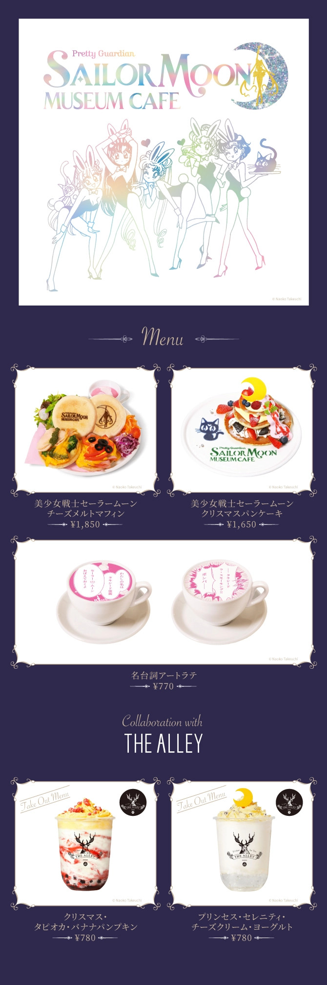 inner senshi; 1850 jenów (ok. 59 zł). Christmas Pancake - warstwowo układane naleśniki, które mają w ten sposób przypominać choinkę; przełożone śmietaną i owocami; 1640 jenów (ok. 53 zł). Meizerifu Latte Art - kawa latte z