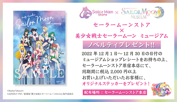 W Sailor Moon Store i Sailor Moon Museum pojawią się prezenty dla klientów. W grudniu klienci, którzy zrobią zakupy w Sailor Moon Museum za przynajmniej 2000 jenów mogą wymienić paragon na naklejkę w stacjonarnym sklepie Sailor Moon Store.