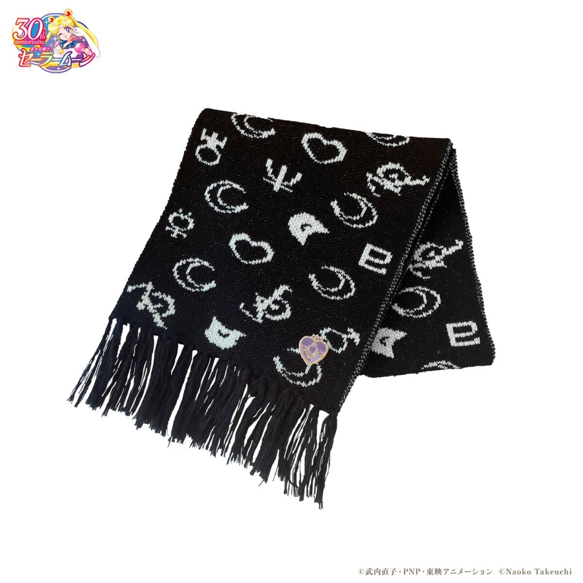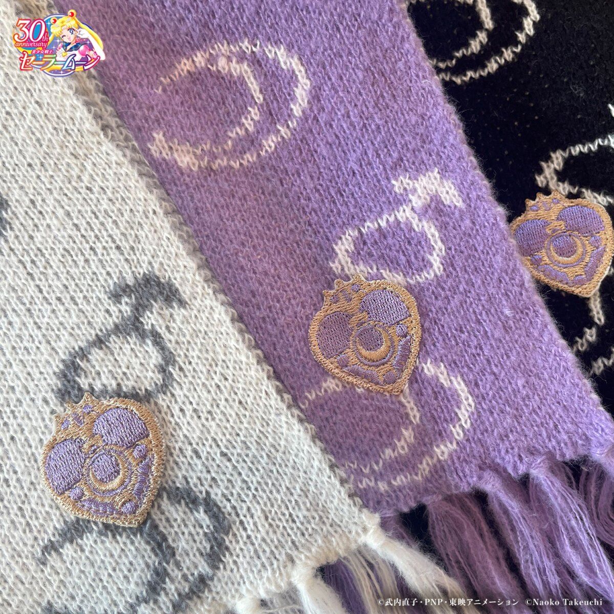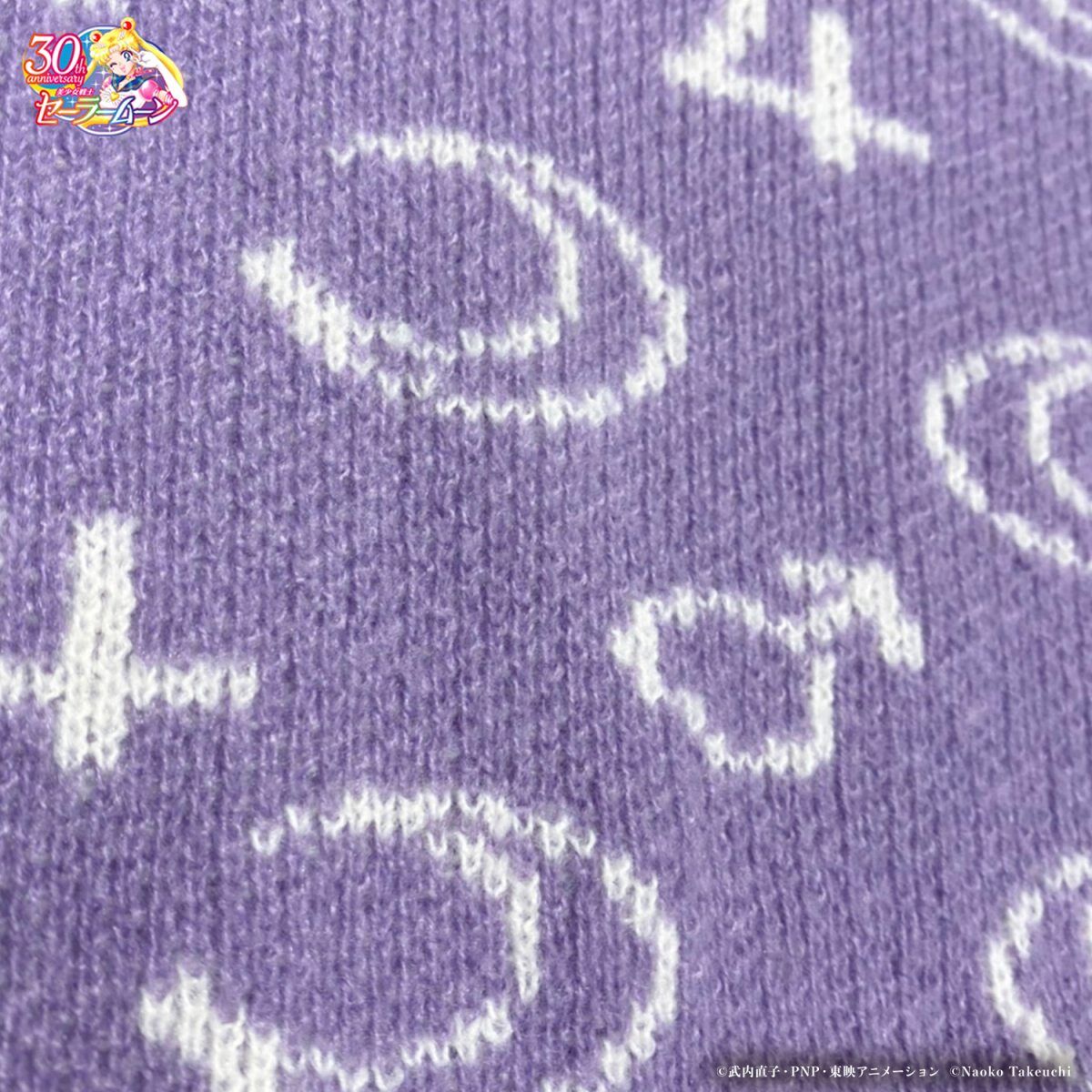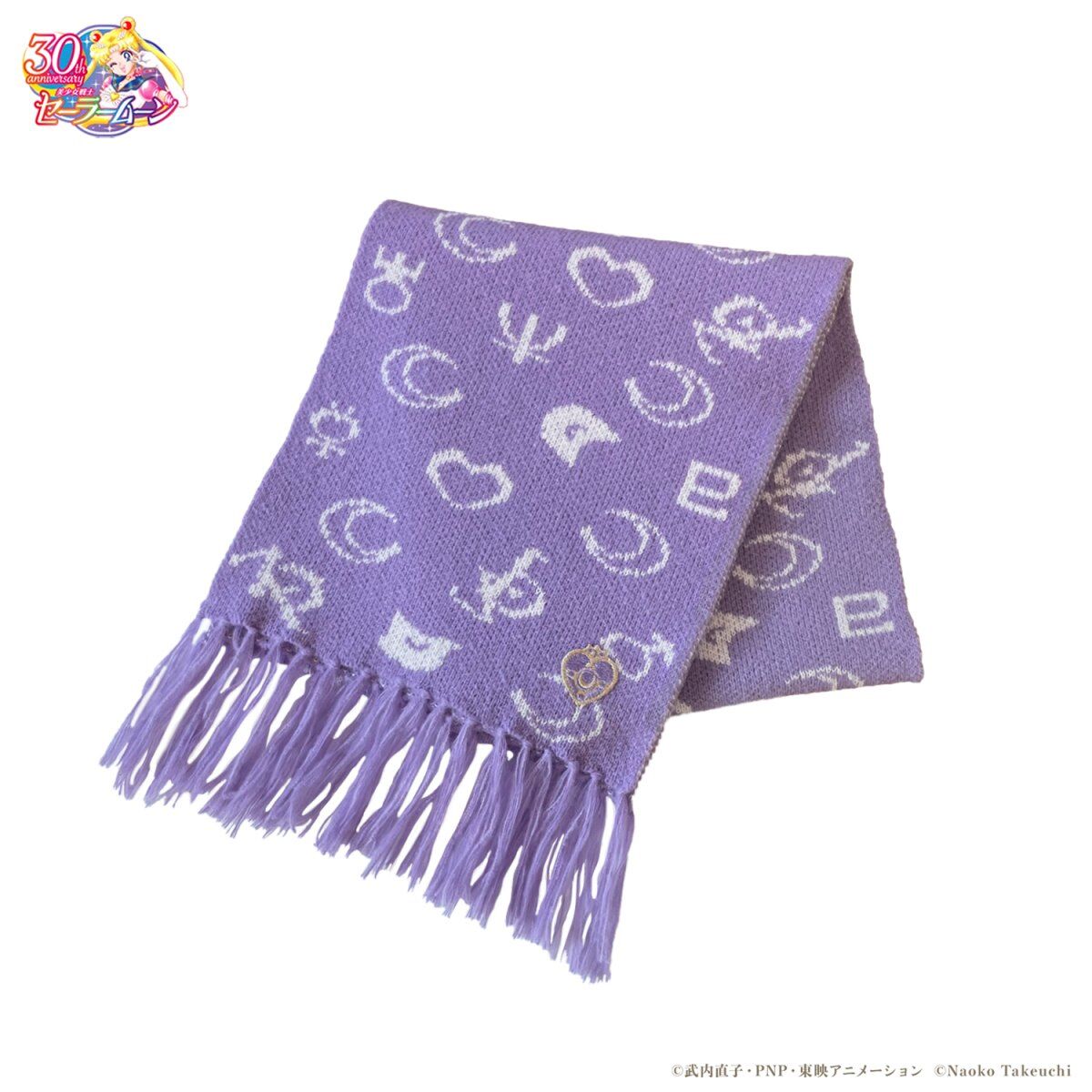 890 jenów (ok. 358 zł) za sztukę. Swetry - biały, fioletowy lub czarny ze znakami planet inner senshi; aplikacja z Henshin Brooch; rozmiar uniwersalny; 9790 jenów (ok. 322 zł) za sztukę. Szaliki - biały, fioletowy lub czarny