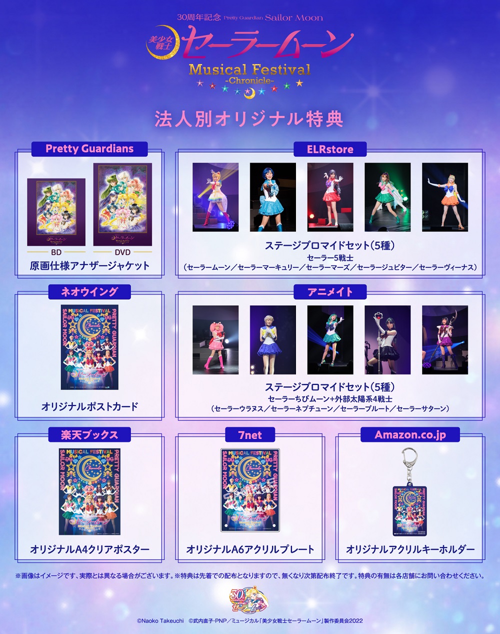 na bilety oraz akrylowe zawieszki; etui na bilety dostępne są w trzech wzorach: Three Lights, Eternal Sailor Moon oraz sylwetki wojowniczek; wysokość etui to 18 cm; akrylowe zawieszki są dwie i przedstawiają broszki Eternal Sailor