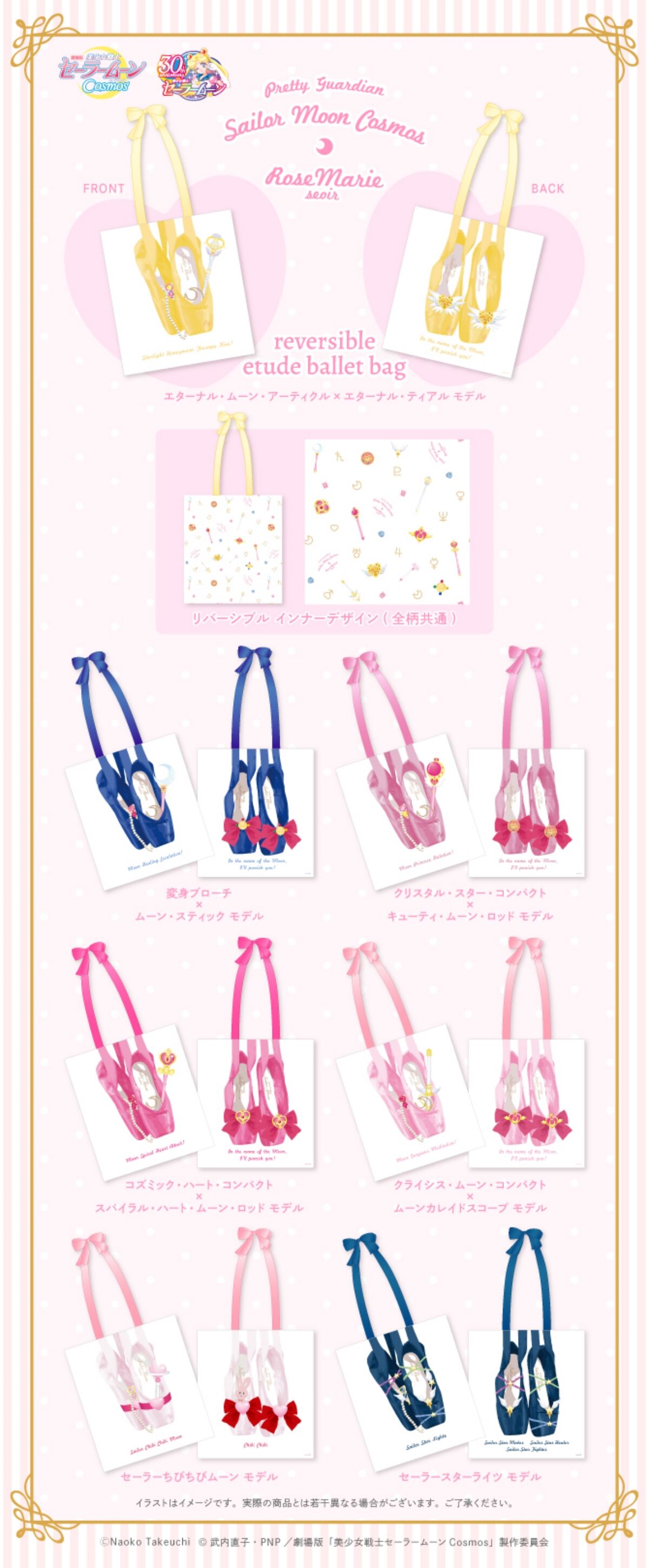 We współpracy z RoseMarie seoir ponownie pojawią się torby zakupowe z nadrukami baletek. Dostępne będzie 7 wzorów inspirowanych magicznymi przedmiotami Sailor Moon (Eternal Moon Article/Eternal Tiare, Henshin Brooch/Moon Stick, Crystal
