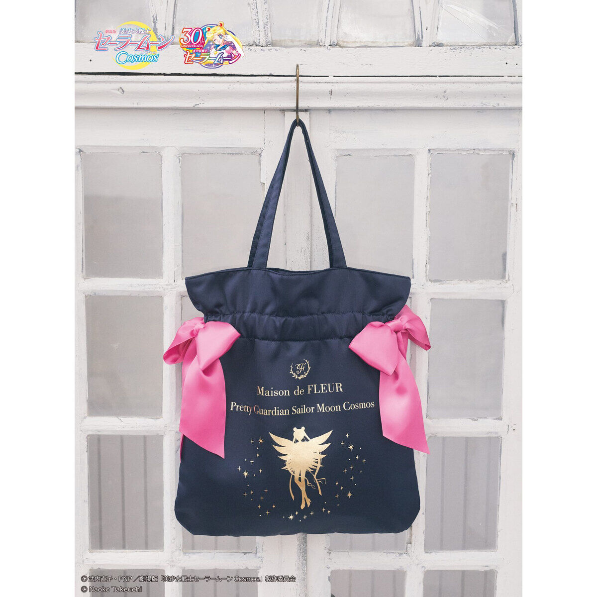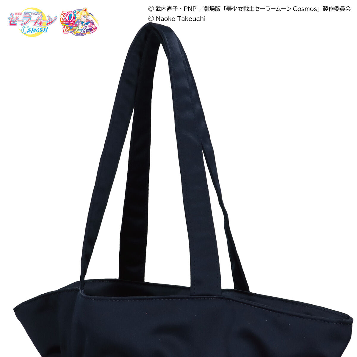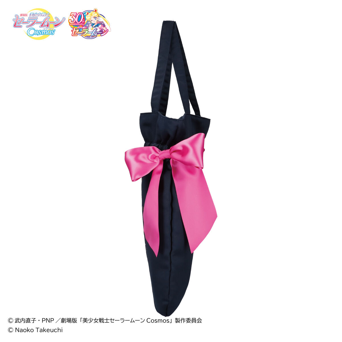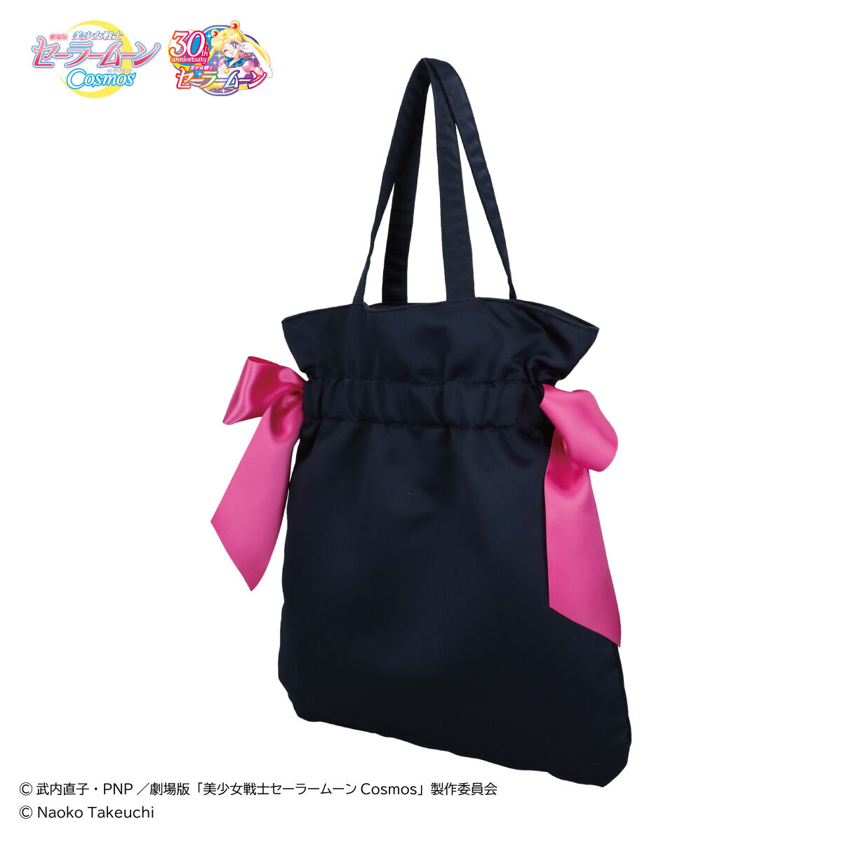 Torby na zakupy - granatowe; z dwiema kokardami; do wyboru wzory inspirowane Sailor Moon i Sailor Starlights; wymiary torby to 45 x 42 cm; 6900 jenów (ok. 173 zł) za sztukę.