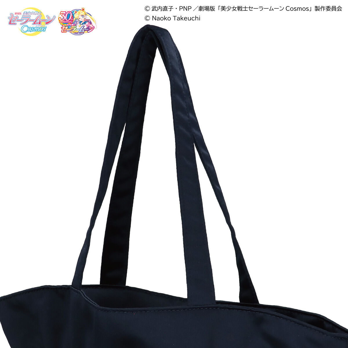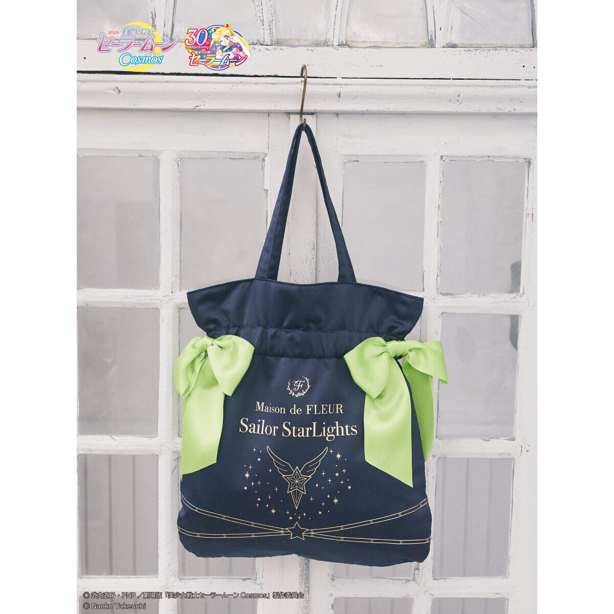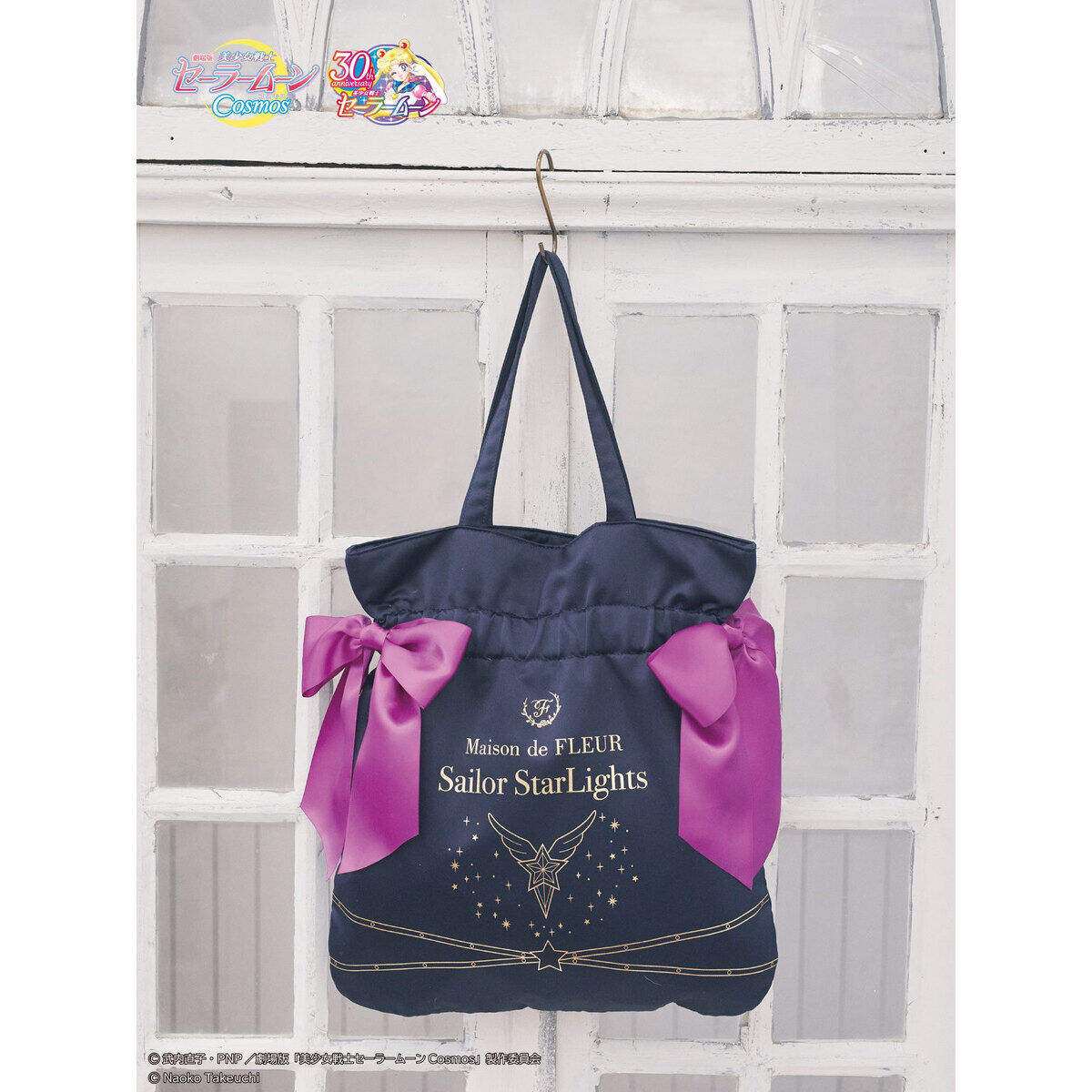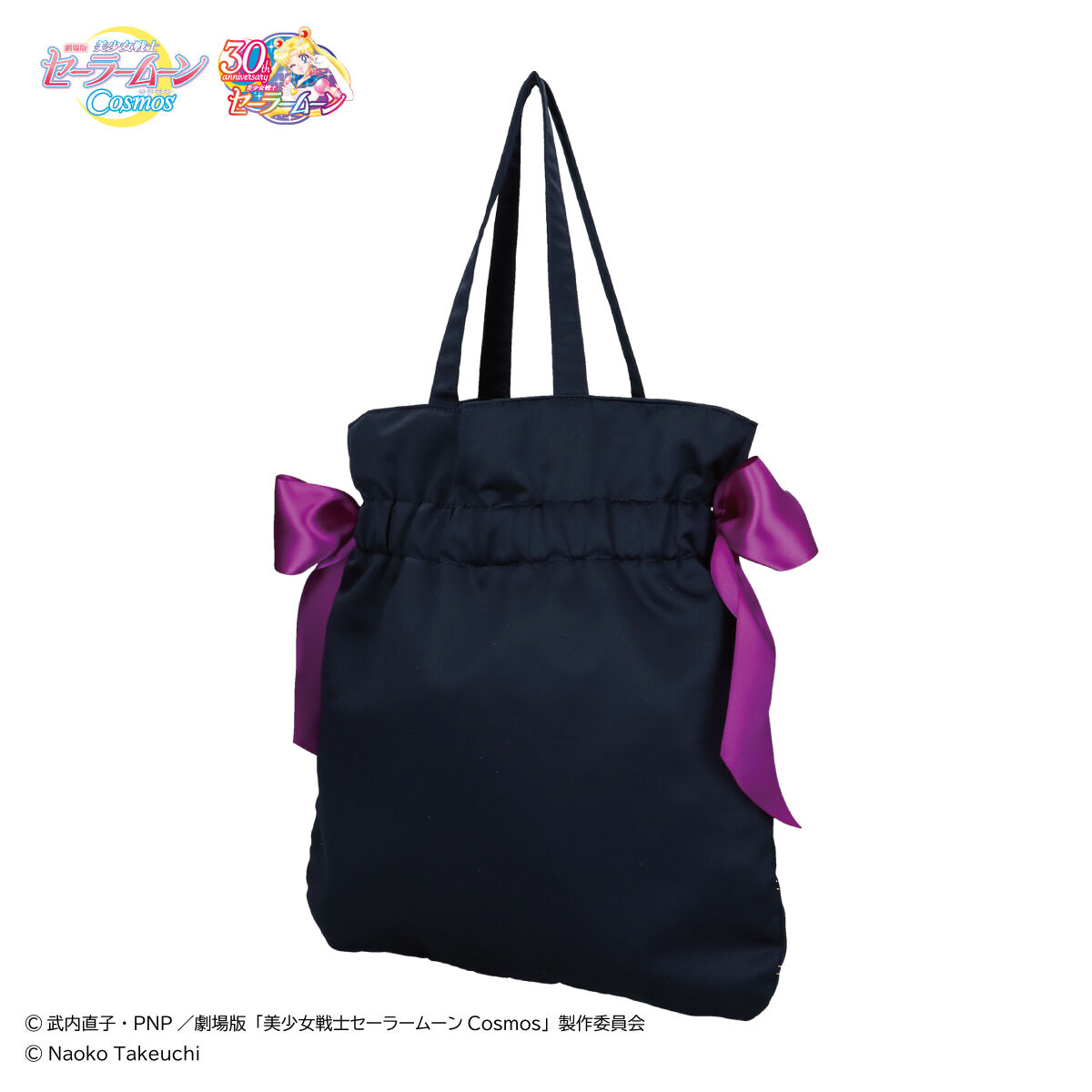 Torby na zakupy - granatowe; z dwiema kokardami; do wyboru wzory inspirowane Sailor Moon i Sailor Starlights; wymiary torby to 45 x 42 cm; 6900 jenów (ok. 173 zł) za sztukę.