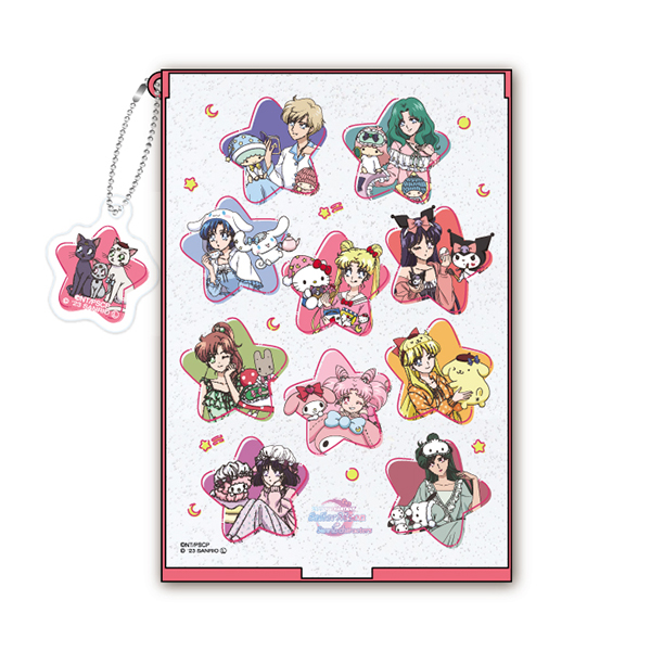We współpracy z Sanrio Characters pojawią się dwa typy breloków. Pierwszy typ breloków może być jednocześnie akrylowymi ozdobami, a drugi to wyłącznie breloki. W obu wypadkach do uzbierania jest po 10 sztuk, na każdym breloku wzór z jedną postacią Sailor Moon i jedną postacią Sanrio. Breloki-ozdoby kosztują 880 jenów za sztukę (ok. 30 zł), a same breloki kosztują 990 jenów za sztukę (ok. 33 zł). W sprzedaży będą dostępne w czerwcu.