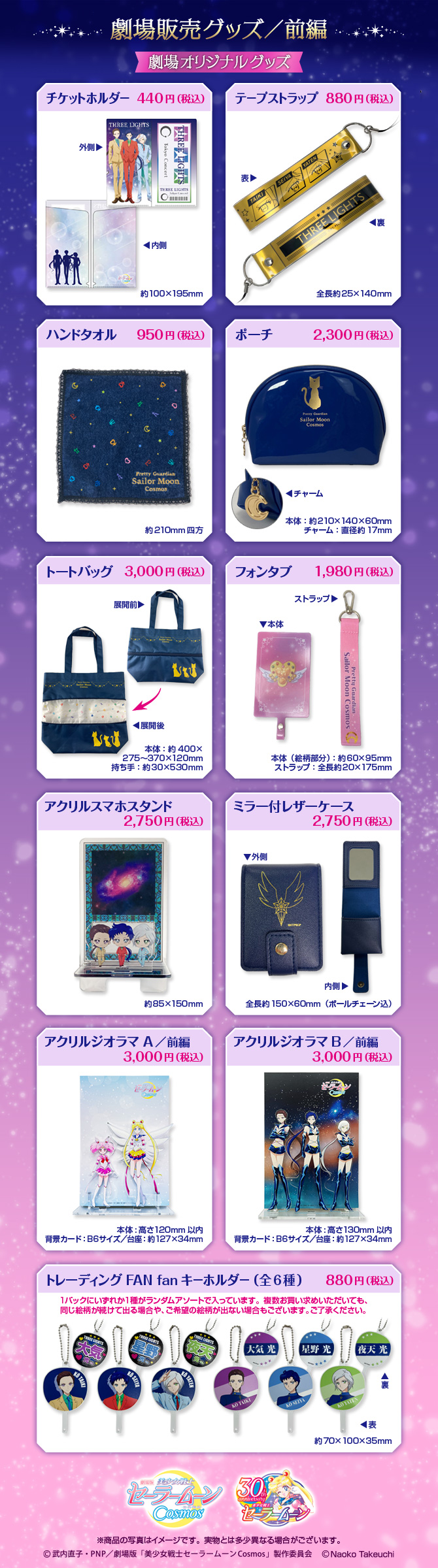 Gadżety do filmów Cosmos sprzedawane w Sailor Moon Store. W sklepie stacjonarnym będą sprzedawane od 2 czerwca, a w sklepie online będą dostępne od 19 czerwca (Pretty Guardians) i od 22 czerwca (regularni klienci).