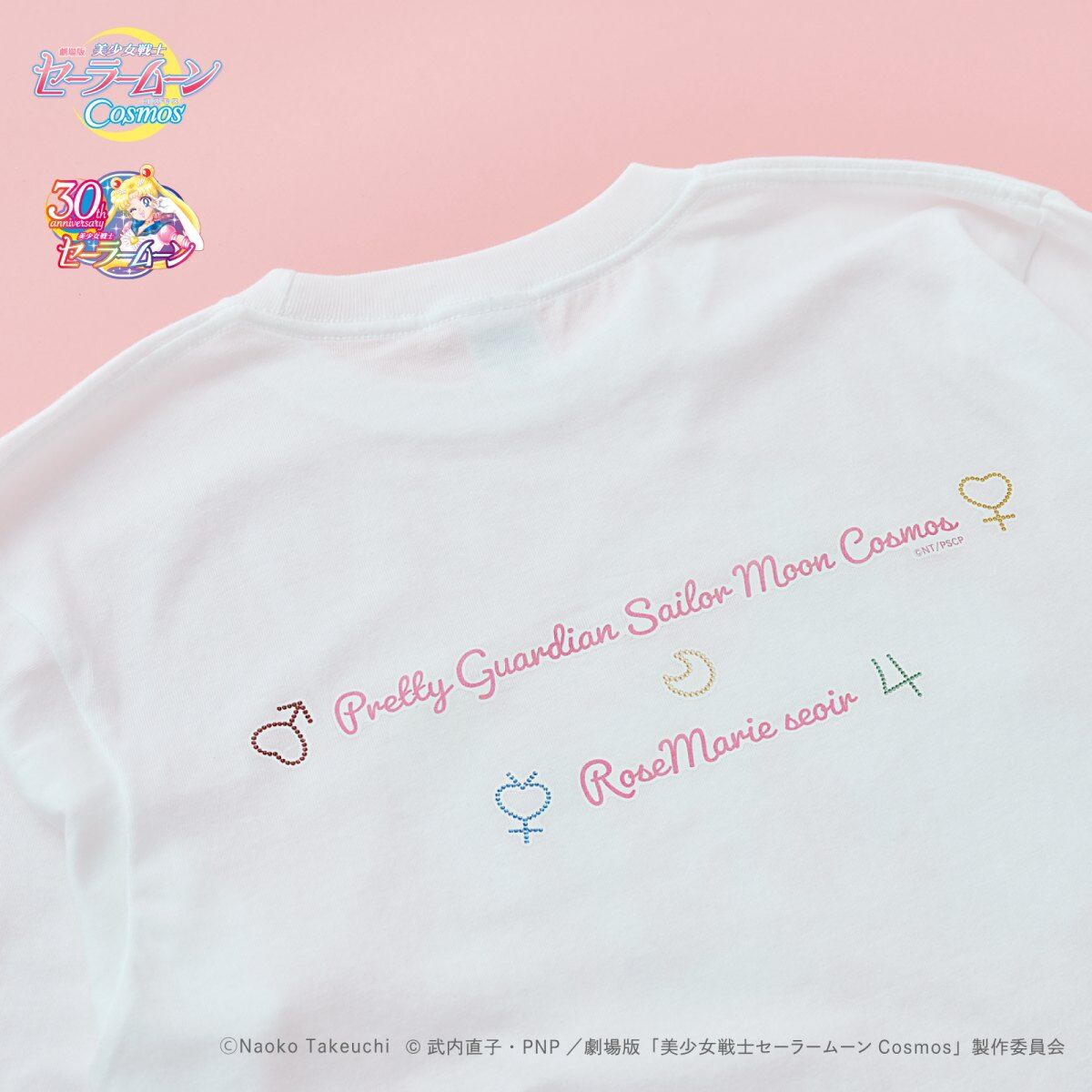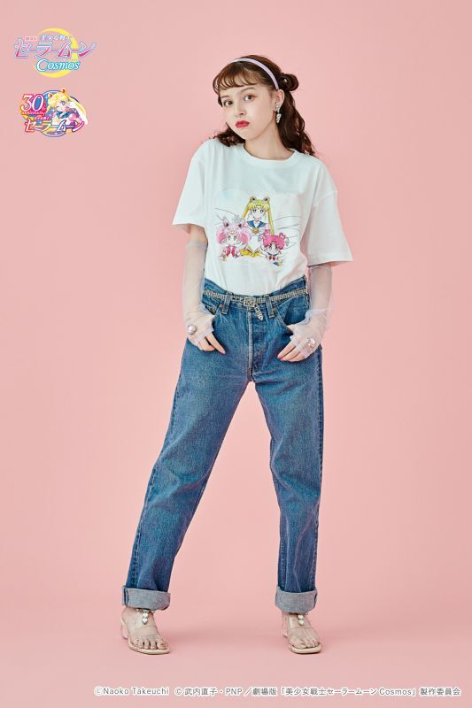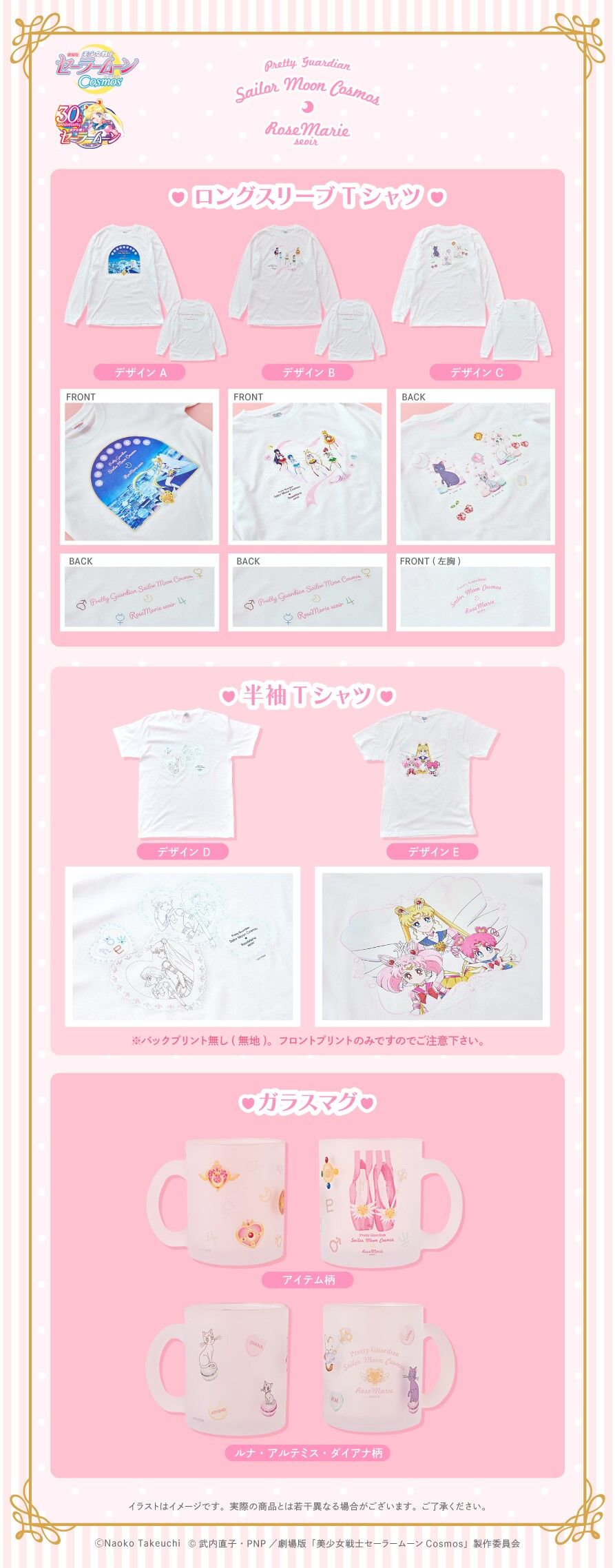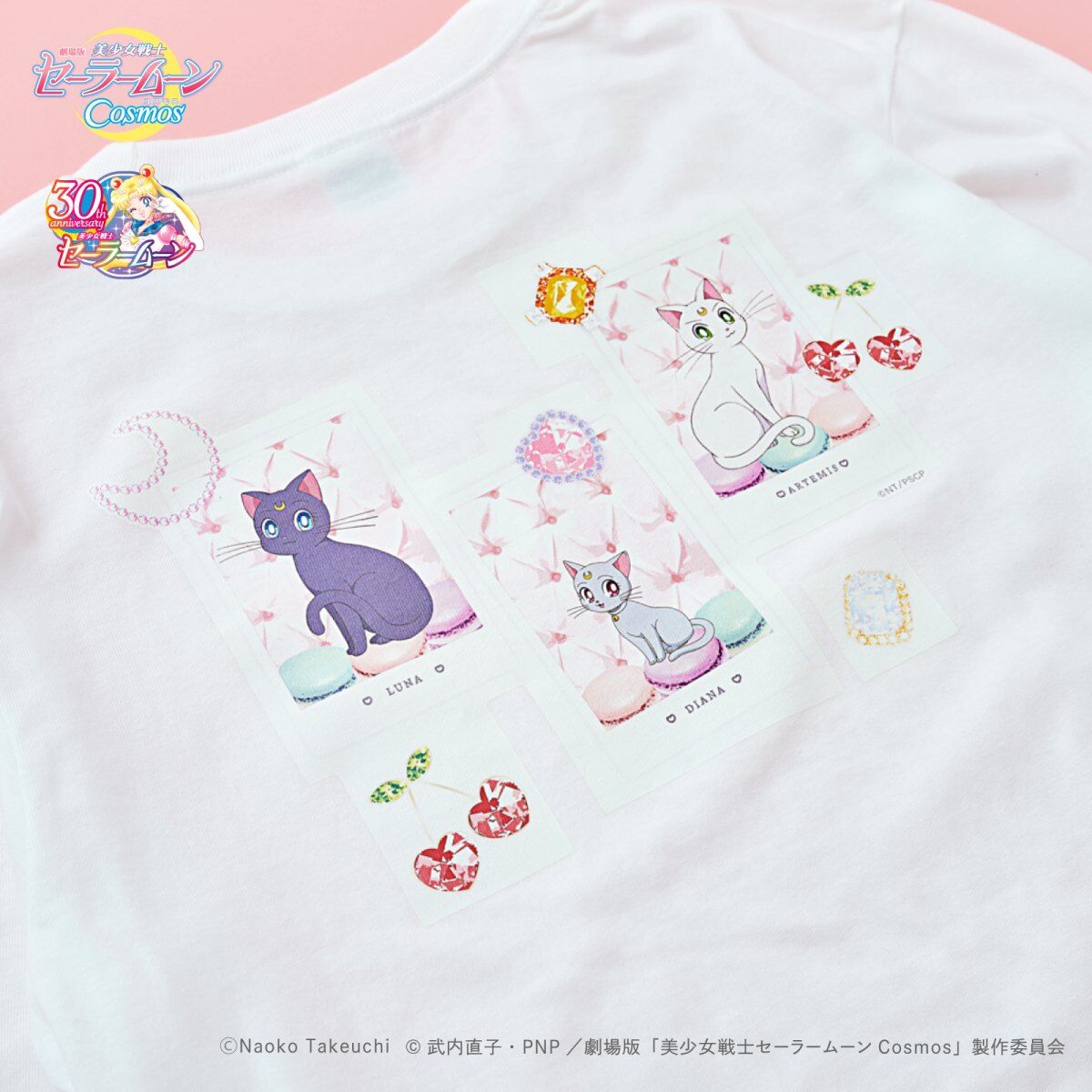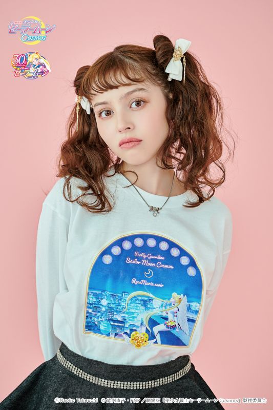 promującą filmy Cosmos (A), z inner senshi (B) oraz z kotami (C); dostępne rozmiary XS i M; 10 780 jenów (ok. 305 zł) za sztukę. - koszulki z krótkim rękawem; białe; do wyboru dwa wzory: z outer senshi (D) oraz z Moon, Chibi Moon