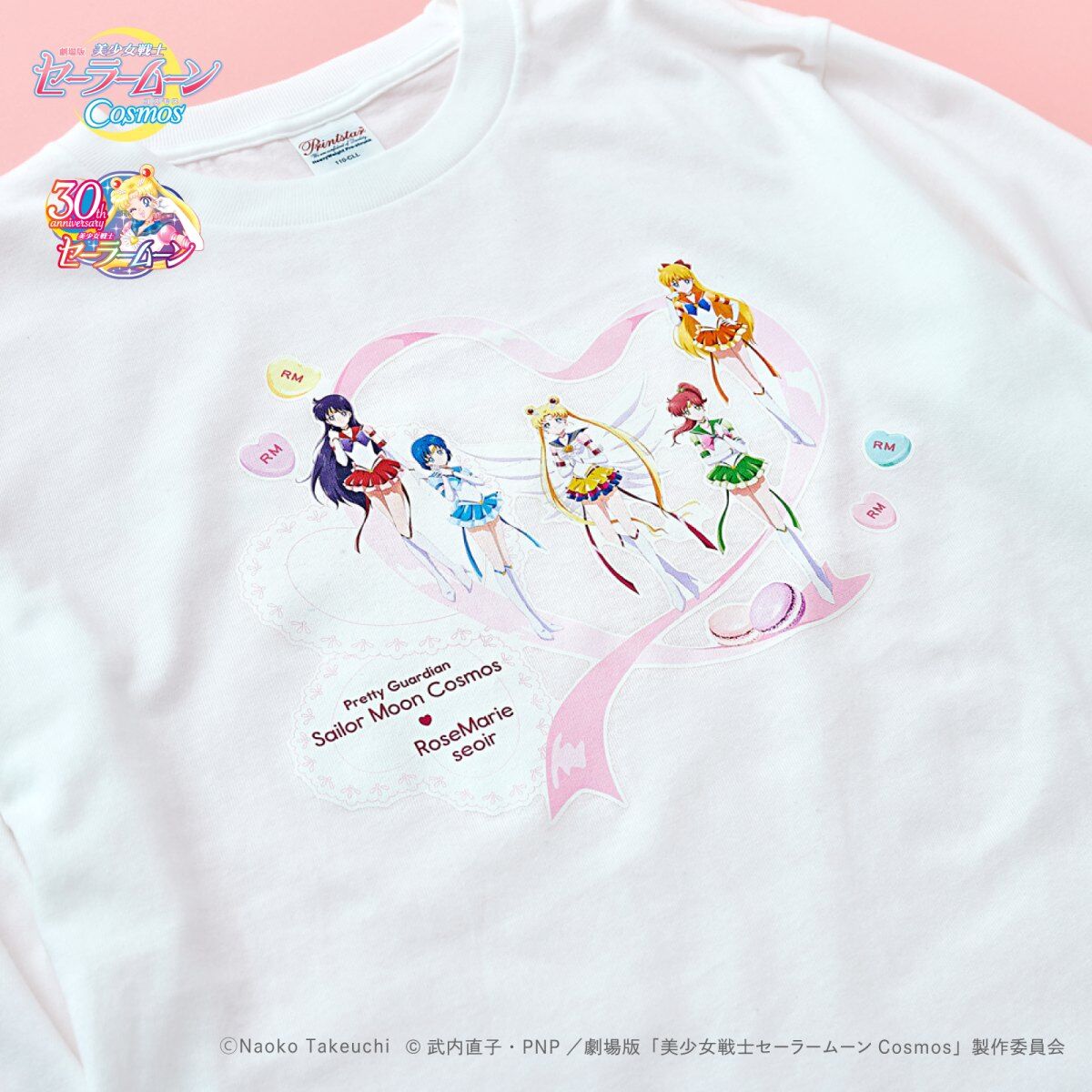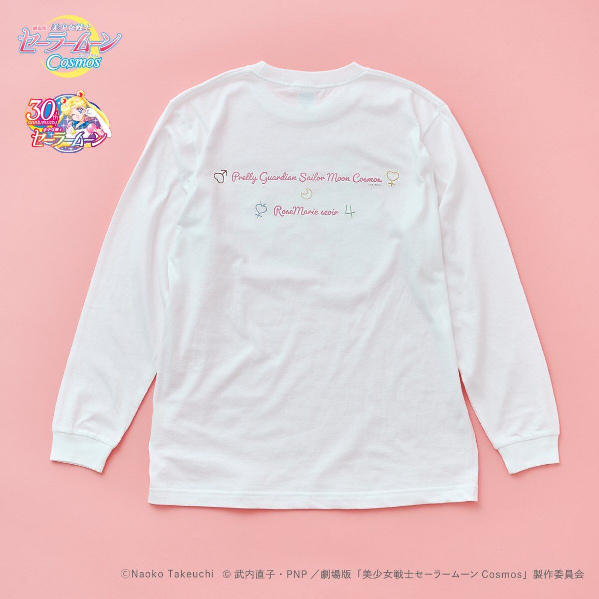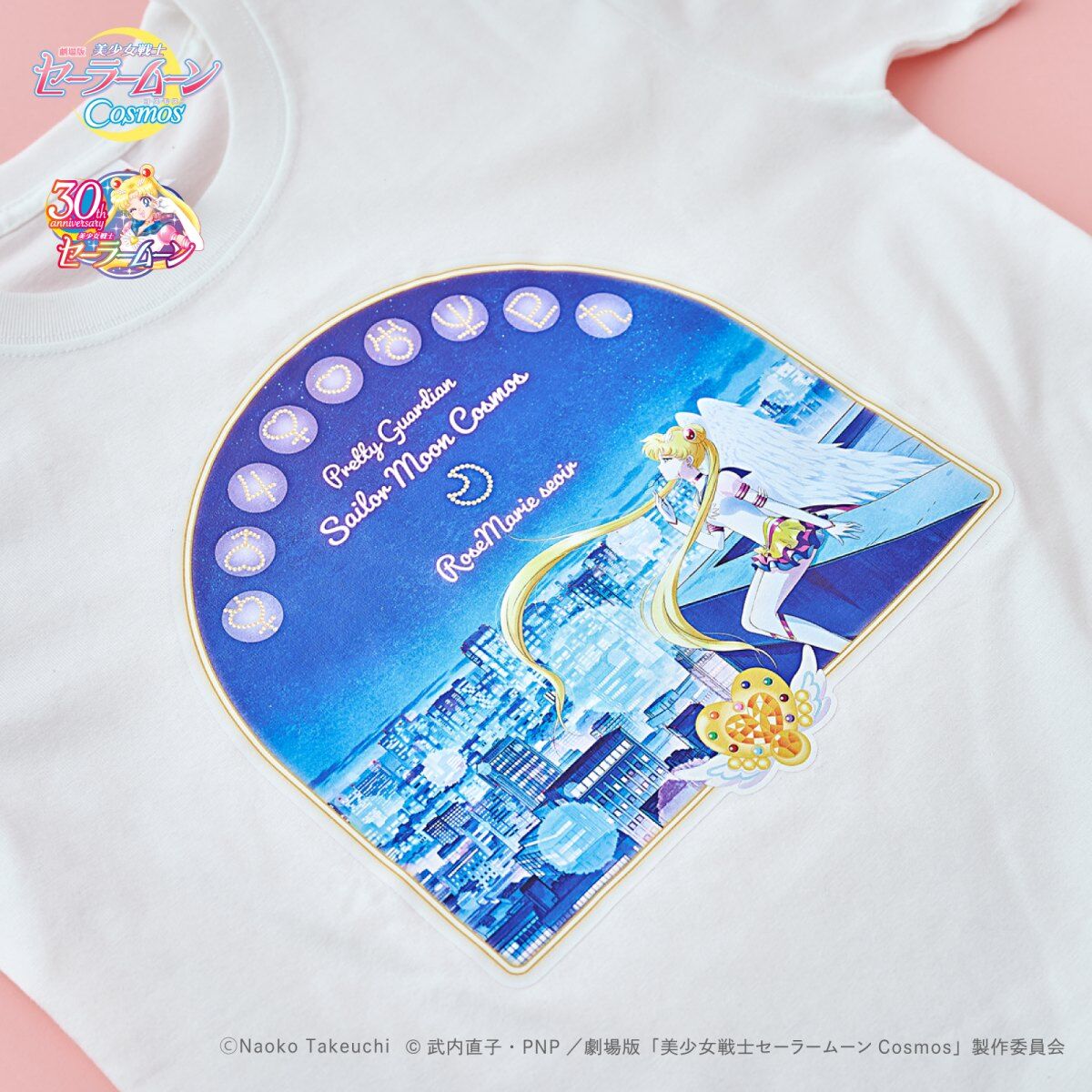 promującą filmy Cosmos (A), z inner senshi (B) oraz z kotami (C); dostępne rozmiary XS i M; 10 780 jenów (ok. 305 zł) za sztukę. - koszulki z krótkim rękawem; białe; do wyboru dwa wzory: z outer senshi (D) oraz z Moon, Chibi Moon