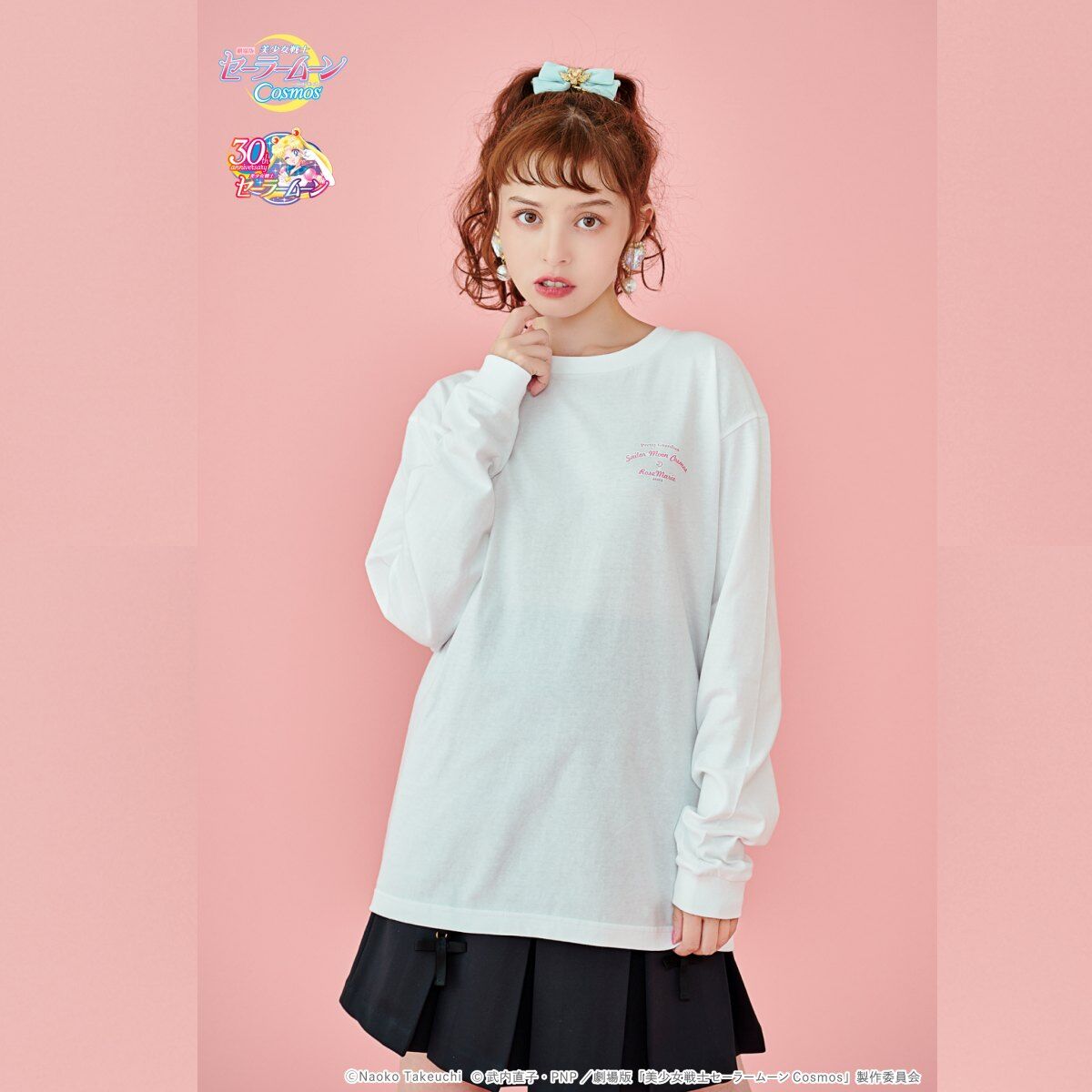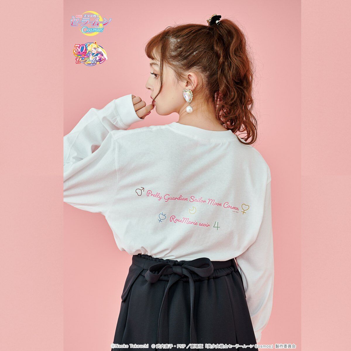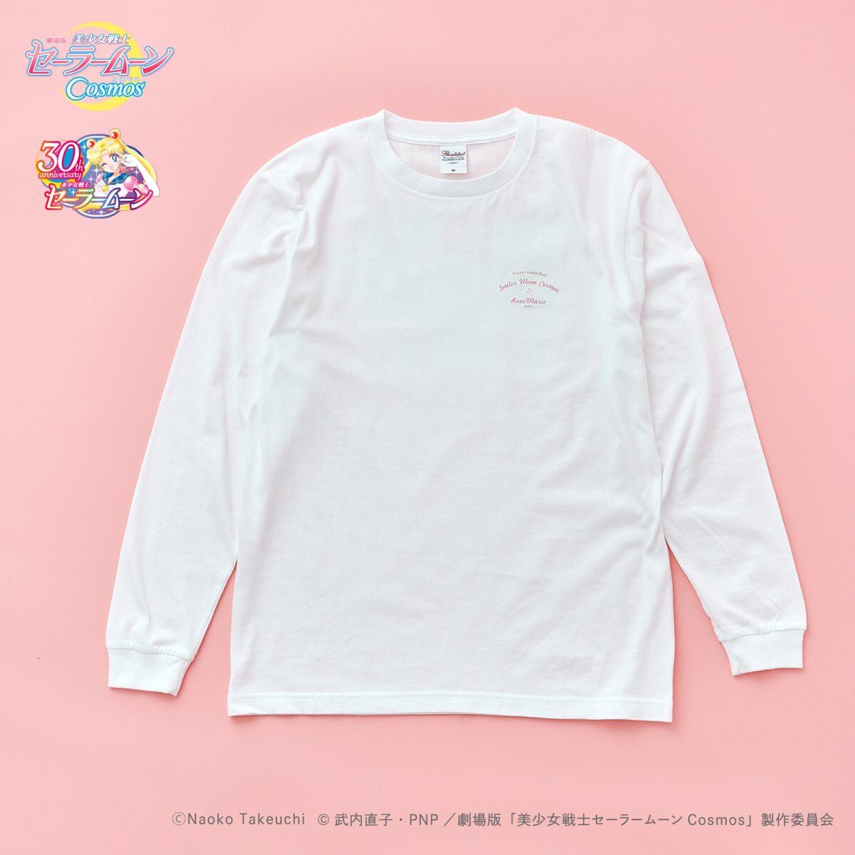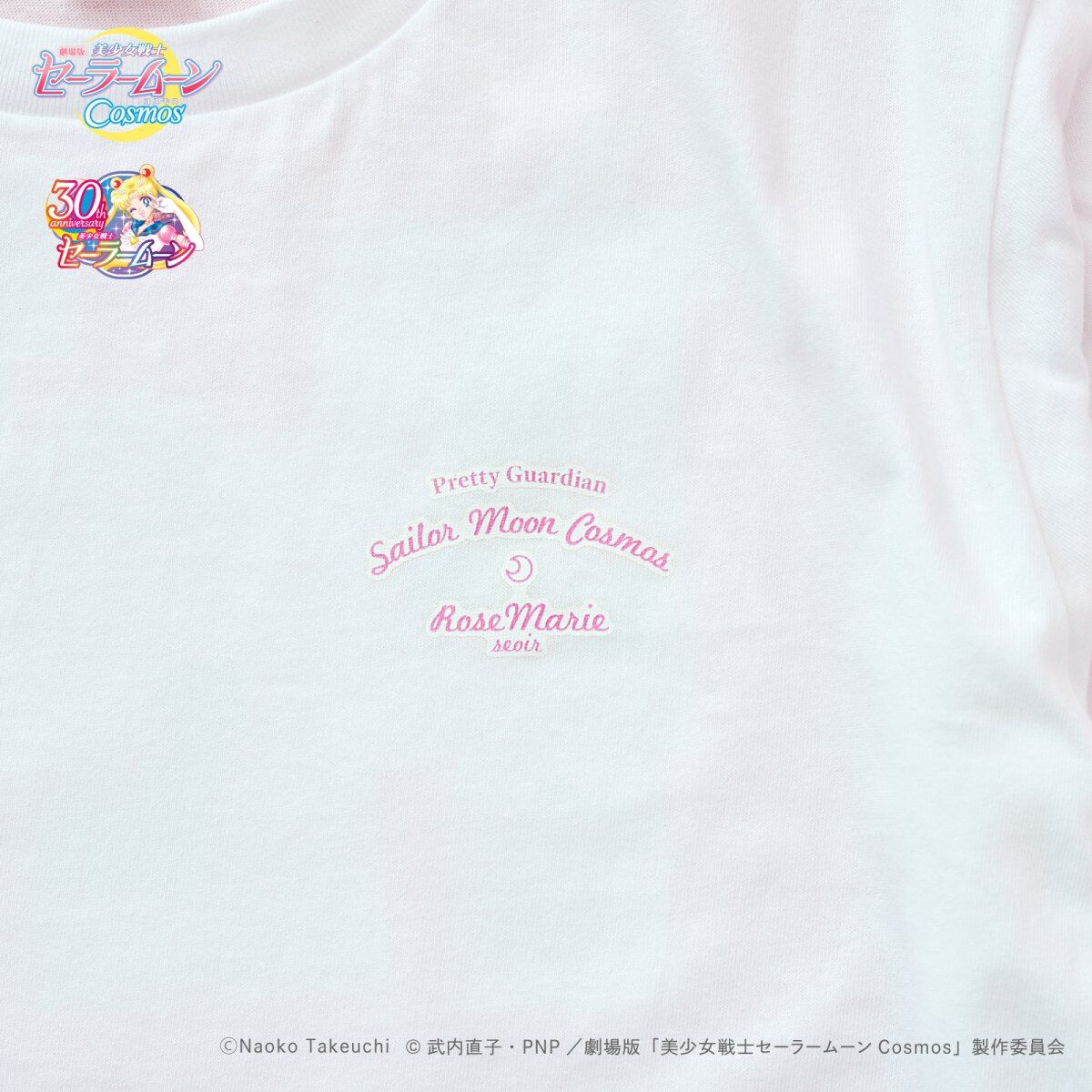 promującą filmy Cosmos (A), z inner senshi (B) oraz z kotami (C); dostępne rozmiary XS i M; 10 780 jenów (ok. 305 zł) za sztukę. - koszulki z krótkim rękawem; białe; do wyboru dwa wzory: z outer senshi (D) oraz z Moon, Chibi Moon