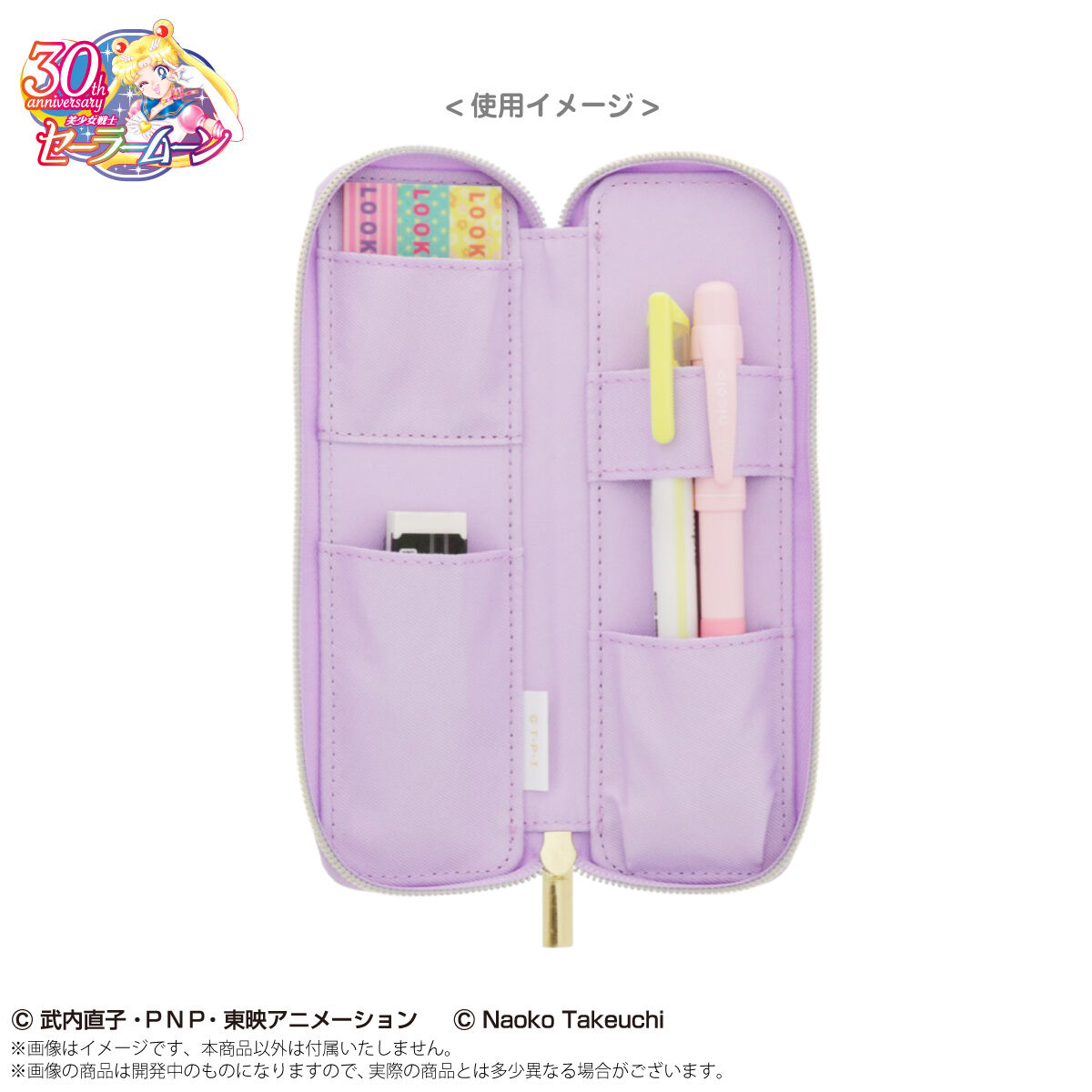 Również we wrześniu pojawią się wąskie piórniki na podstawowe przybory. Do wyboru będą dwa wzory, lawendowy z broszką Henshin Brooch oraz granatowy z kotami. Zamykane na zamek błyskawiczny, w środku kieszonki na przybory. Wymiary piórnika