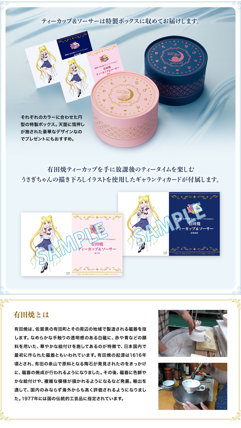 Spodki i filiżanki wykonane z porcelany Arita pojawiły się w sprzedaży 20 września. Filiżanki mają wymiary 10,5 x 6 cm, szerokość razem z uchem to 13,5 cm, spodki mierzą 16 x 1,6 cm. Do zestawów są dołączone ozdobne karty gwarancyjne z
